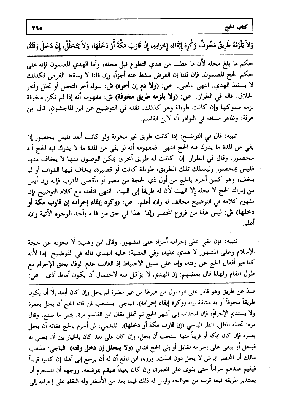تنبيه: قال في التوضيح إذا كانت طريق غير مخوفة ولو كانت أبعد فليس بمحصور إن بقي من المدة ما يدرك فيه الحج انتهى. فمفهومه أنه لو بقي من المدة ما لا يدرك فيه الحج أنه محصور. وقال في الطراز إن كانت له طريق أخرى يمكن الوصول منها لا يخاف منها فليس بمحصور وليسلك تلك الطريق طويلة كانت أو قصيرة يخاف فيها الفوات أو لم يخف وهو كمن أحرم بالحج من أول ذي الحجة من مصر أو بأقصى المغرب فإنه وإن أيس من إدراك الحج لا يحله إلا البيت لأن له طريقا إلى البيت انتهى فتأمله مع كلام التوضيح فإن مفهوم كلامه في التوضيح مخالف له والله أعلم. ص: "وكره إبقاء إحرامه إن قارب مكة أو دخلها" ش: ليس هذا من فروع: المحصر وإنما هذا في حق من فاته بأحد الوجوه الآتية والله أعلم. تنبيه: فإن بقي على إحرامه أجزاه على المشهور. وقال ابن وهب لا يجزيه عن حجة الإسلام وعلى المشهور لا هدي عليه وفي العتبية عليه الهدي قاله في التوضيح إما لأنه كتأخير أفعال الحج عن وقته وإما على سبيل الاحتياط إذ الغالب عدم الوفاء بحق الإحرام مع طول المقام ولهذا قال بعضهم إن الهدي لا يؤكل منه لاحتمال أن يكون أماط أذى. ص: