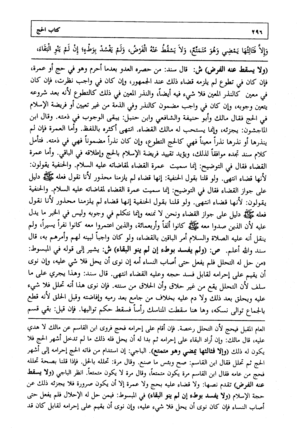 "ولا يسقط عنه الفرض" ش: قال سند من حصره العدو بعدما أحرم وهو في حج أو عمرة فإن كان في تطوع لم يلزمه قضاء ذلك عند الجمهور وإن كان في واجب نظرت فإن كان في معين كالنذر المعين فلا شيء فيه أيضا والنذر المعين في ذلك كالتطوع لأنه بعد شروعه يتعين وجوبه وإن كان في واجب مضمون كالنذر وفي الذمة من غير تعيين أو فريضة الإسلام في الحج فقال مالك وأبو حنيفة والشافعي وابن حنبل يبقى الوجوب في ذمته. وقال ابن الماجشون يجزئه وإنما يستحب له مالك القضاء. انتهى أكثره باللفظ. وأما العمرة فإن لم ينذرها أو نذرها نذرا معينا فهي كالحج التطوع وإن كان نذرا مضمونا فهي في ذمته. فتأمل كلام سند تجده موافقا لذلك ويؤيد تقييد فريضة الإسلام بالحج وإطلاقه في الباقي. وأما عمرة القضاء فقال في التوضيح إنما سميت عمرة القضاء لمقاضاته عليه السلام. والحنفية يقولون لأنها قضاء انتهى. ولو قلنا بقول الحنفية إنها قضاء لم يلزمنا محذور لأنا نقول فعله صلى الله عليه وسلم دليل على جواز القضاء فقال في التوضيح إنما سميت عمرة القضاء لمقاضاته عليه السلام. والحنفية يقولون لأنها قضاء انتهى. ولو قلنا بقول الحنفية إنها قضاء لم يلزمنا محذور لأنا نقول فعله صلى الله عليه وسلم دليل على جواز القضاء ونحن لا نمنعه وإنما نتكلم في وجوبه وليس في الخبر ما يدل عليه لأن الذين صدوا معه صلى الله عليه وسلم كانوا ألفا وأربعمائة والذين اعتمروا معه كانوا نفرا يسيرا ولم ينقل أنه عليه الصلاة والسلام أمر الباقين بالقضاء ولو كان واجبا لبينه لهم وأمرهم به قال سند والله أعلم. ص: "ولم يفسد بوطء إن لم ينو البقاء" ش: يشير إلى قوله في المبسوط من حل له التحلل فلم يفعل حتى أصاب النساء أنه إن نوى أن يحل فلا شي عليه وإن نوى أن يقيم على إحرامه لقابل فسد حجه وعليه القضاء انتهى. قال سند وهذا يجري على ما سلف لأن التحلل يقع من غير حلاق وأن الحلاق من سنته. فإن نوى هذا أنه تحلل فلا شيء عليه ويحلق بعد ذلك ولا دم عليه بخلاف من جامع بعد رميه وإفاضته وقبل الحلق لأنه قطع بالجماع توالى نسكه وها هنا سقطت المناسك رأسا فسقط حكم تواليها. فإن قيل بقي قسم