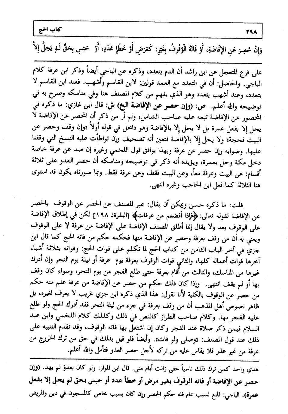 على فرع المتعجل عن ابن راشد أن الدم يتعدد وذكره عن الباجي أيضا وذكر ابن عرفة كلام الباجي. والحاصل أن في التعدد مع العمد قولين لابن القاسم وأشهب. فعند ابن القاسم لا يتعدد وعند أشهب يتعدد وهو الذي يفهم من كلام المصنف هنا وفي مناسكه وصرح به في توضيحه والله أعلم. ص: "وإن حصر عن الإفاضة" الخ ش: قال ابن غازي ما ذكره في المحصور عن الإفاضة تبعه عليه صاحب الشامل ولم أر من ذكر أن المحصر عن الإفاضة لا يحل إلا بفعل عمرة بل لا يحل إلا بالإفاضة وهو داخل في قوله أولا "وإن وقف وحصر عن البيت فحجة" ولا يحل إلا بالإفاضة فتعين أنه تصحيف وإن تواطأت عليه النسخ التي وقفنا عليها. وصوابه وإن حصر عن عرفة وبهذا يوافق قول اللخمي وغيره إن صد عن عرفة خاصة دخل مكة وحل بعمرة ويؤيده أنه ذكر في توضيحه ومناسكه أن حصر العدو على ثلاثة أقسام عن البيت وعرفة معا وعن البيت فقط وعن عرفة فقط. وبما صورناه يكون قد استوى هنا الثلاثة كما فعل ابن الحاجب وغيره انتهى.