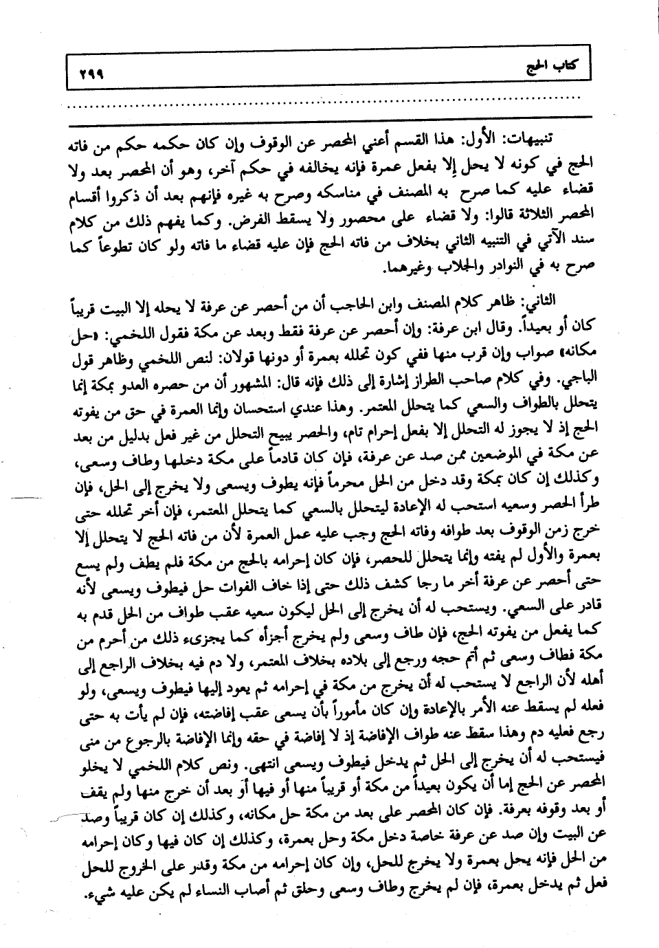 تنبيهات: الأول: هذا القسم أعني المحصر عن الوقوف وإن كان حكمه حكم من فاته الحج في كونه لا يحل إلا بفعل عمرة فإنه يخالفه في حكم آخر وهو أن المحصر بعد ولا قضاء عليه كما صرح به المصنف في مناسكه وصرح به غيره فإنهم بعد أن ذكروا أقسام المحصر الثلاثة قالوا ولا قضاء على محصور ولا يسقط الفرض. وكما يفهم ذلك من كلام سند الآتي في التنبيه الثاني بخلاف من فاته الحج فإن عليه قضاء ما فاته ولو كان تطوعا كما صرح به في النوادر والجلاب وغيرهما.