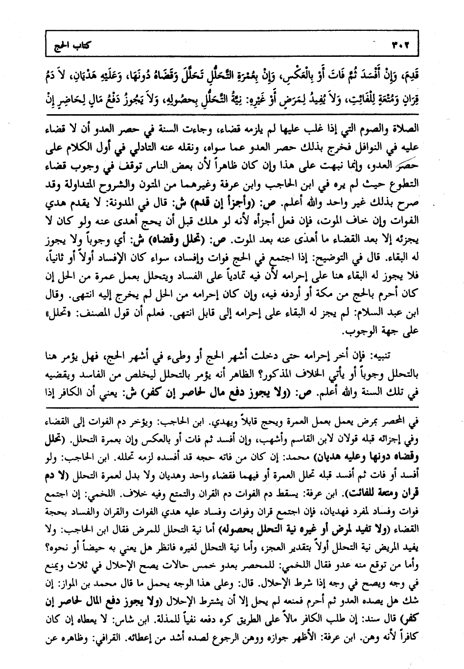 الصلاة والصوم التي إذا غلب عليها لم يلزمه قضاء وجاءت السنة في حصر العدو أن لا قضاء عليه في النوافل فخرج بذلك حصر العدو عما سواه ونقله عنه التادلي في أول الكلام على حصر العدو وإنما نبهت على هذا وإن كان ظاهرا لأن بعض الناس توقف في وجوب قضاء التطوع حيث لم يره في ابن الحاجب وابن عرفة وغيرهما من المتون والشروح المتداولة وقد صرح بذلك غير واحد والله أعلم. ص: "وأجزأ إن قدم" ش: قال في المدونة لا يقدم هدي الفوات وإن خاف الموت فإن فعل أجزأه لأنه لو هلك قبل أن يحج أهدى عنه ولو كان لا يجزئه إلا بعد القضاء ما أهدى عنه بعد الموت. ص: "تحلل وقضاه" ش: أي وجوبا ولا يجوز له البقاء. قال في التوضيح إذا اجتمع في الحج فوات وإفساد سواء كان الإفساد أولا أو ثانيا فلا يجوز له البقاء هنا على إحرامه لأن فيه تماديا على الفساد ويتحلل بعمل عمرة من الحل إن كان أحرم بالحج من مكة أو أردفه فيه وإن كان إحرامه من الحل لم يخرج إليه انتهى. وقال ابن عبد السلام لم يجز له البقاء على إحرامه إلى قابل انتهى. فعلم أن قول المصنف تحلل على جهة الوجوب. تنبيه: فإن أخر إحرامه حتى دخلت أشهر الحج أو وطىء في أشهر الحج فهل يؤمر هنا بالتحلل وجوبا أو يأتي الخلاف المذكور الظاهر أنه يؤمر بالتحلل ليخلص من الفاسد ويقضيه في تلك السنة والله أعلم. ص: "ولا يجوز دفع مال لحاصر إن كفر" ش: يعني أن الكافر إذا