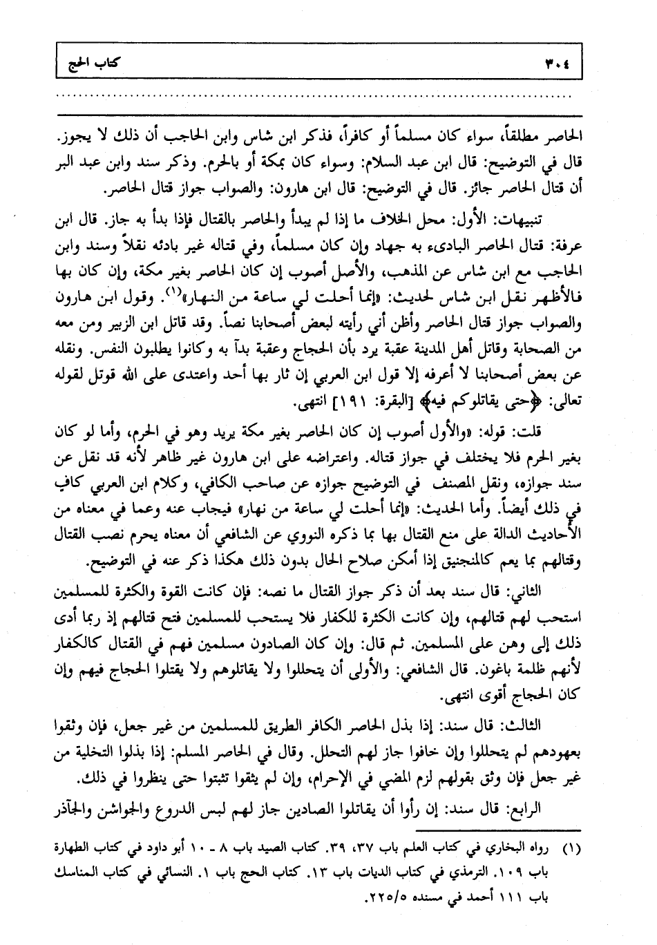 تنبيهات: الأول: محل الخلاف ما إذا لم يبدأ والحاصر بالقتال فإذا بدأ به جاز. قال ابن عرفة قتال الحاصر البادىء به جهاد وإن كان مسلما وفي قتاله غير بادئه نقلا وسند وابن الحاجب مع ابن شاس عن المذهب والأصل أصوب إن كان الحاصر بغير مكة وإن كان بها فالأظهر نقل ابن شاس لحديث "إنما أحلت لي ساعة من النهار"1. وقول ابن هارون والصواب جواز قتال الحاصر وأظن أني رأيته لبعض أصحابنا نصا. وقد قاتل ابن الزبير ومن معه من الصحابة وقاتل أهل المدينة عقبة يرد بأن الحجاج وعقبة بدآ به وكانوا يطلبون النفس. ونقله عن بعض أصحابنا لا أعرفه إلا قول ابن العربي إن ثار بها أحد واعتدى على الله قوتل لقوله تعالى {حَتَّى يُقَاتِلُوكُمْ فِيهِ } [البقرة: من الآية191] انتهى.