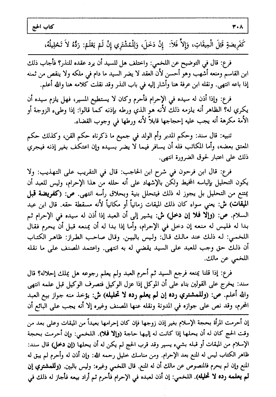 فرع: قال ابن فرحون في شرح ابن الحاجب قال في التقريب على التهذيب ولا يكون التحليل بإلباسه المخيط ولكن بالإشهاد على أنه حلله من هذا الإحرام وليس للعبد أن يمتنع من التحليل بل يجوز له ذلك فيتحلل بنية وبحلاق رأسه انتهى. ص: "كفريضة قبل الميقات" ش: يعني سواء كان ذلك الميقات زمانيا أو مكانيا لأنه مسقطة حقه. قال ابن عبد السلام. ص: "وإلا فلا إن دخل" ش: يشير إلى أن العبد إذا أذن له سيده في الإحرام ثم بدا له فليس له منعه إن دخل في الإحرام وأما إذا بدا له أن يمنعه قبل أن يحرم فقال اللخمي له ذلك عند مالك قال وليس بالبين. وقال صاحب الطراز ظاهر الكتاب أن ذلك حق وجب للعبد على السيد يقضي له به انتهى. واعتمد المصنف على ما نقله اللخمي عن مالك.