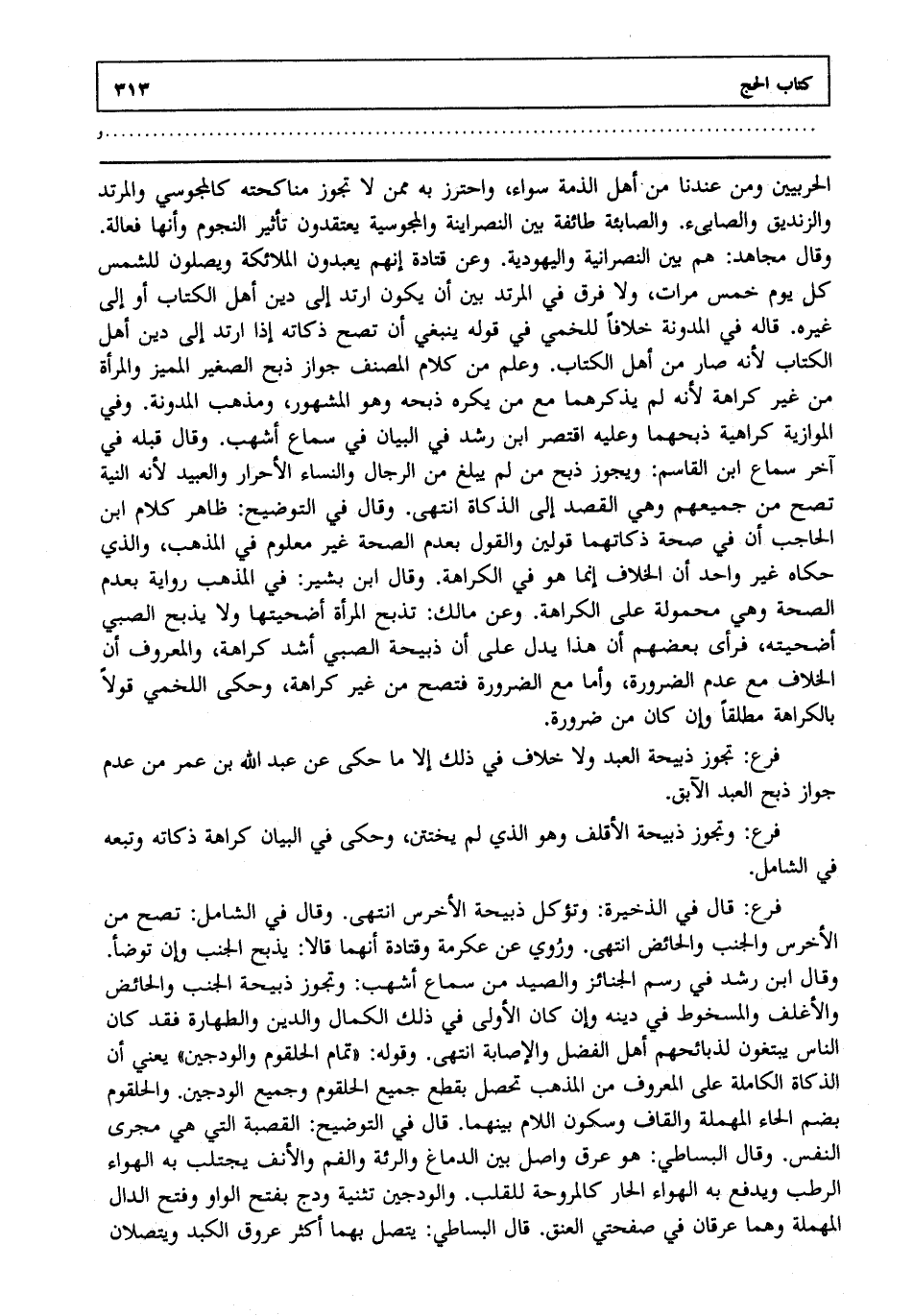 الحربيين ومن عندنا من أهل الذمة سواء واحترز به ممن لا تجوز مناكحته كالمجوسي والمرتد والزنديق والصابىء. والصابئة طائفة بين النصراينة والمجوسية يعتقدون تأثير النجوم وأنها فعالة. وقال مجاهد هم بين النصرانية واليهودية. وعن قتادة إنهم يعبدون الملائكة ويصلون للشمس كل يوم خمس مرات ولا فرق في المرتد بين أن يكون ارتد إلى دين أهل الكتاب أو إلى غيره. قاله في المدونة خلافا للخمي في قوله ينبغي أن تصح ذكاته إذا ارتد إلى دين أهل الكتاب لأنه صار من أهل الكتاب. وعلم من كلام المصنف جواز ذبح الصغير المميز والمرأة من غير كراهة لأنه لم يذكرهما مع من يكره ذبحه وهو المشهور ومذهب المدونة. وفي الموازية كراهية ذبحهما وعليه اقتصر ابن رشد في البيان في سماع أشهب. وقال قبله في آخر سماع ابن القاسم ويجوز ذبح من لم يبلغ من الرجال والنساء الأحرار والعبيد لأنه النية تصح من جميعهم وهي القصد إلى الذكاة انتهى. وقال في التوضيح ظاهر كلام ابن الحاجب أن في صحة ذكاتهما قولين والقول بعدم الصحة غير معلوم في المذهب والذي حكاه غير واحد أن الخلاف إنما هو في الكراهة. وقال ابن بشير في المذهب رواية بعدم الصحة وهي محمولة على الكراهة. وعن مالك تذبح المرأة أضحيتها ولا يذبح الصبي أضحيته فرأى بعضهم أن هذا يدل على أن ذبيحة الصبي أشد كراهة والمعروف أن الخلاف مع عدم الضرورة وأما مع الضرورة فتصح من غيركراهة وحكى اللخمي قولا بالكراهة مطلقا وإن كان من ضرورة.