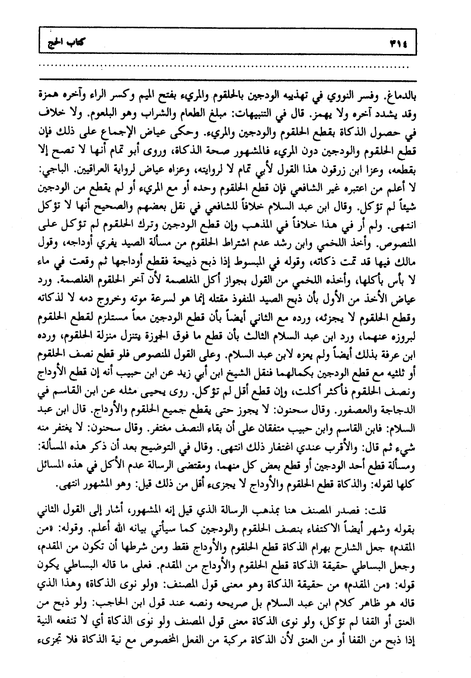 قلت: فصدر المصنف هنا بمذهب الرسالة الذي قيل إنه المشهور أشار إلى القول الثاني بقوله وشهر أيضا الاكتفاء بنصف الحلقوم والودجين كما سيأتي بيانه الله أعلم وقوله من المقدم جعل الشارح بهرام الذكاة قطع الحلقوم والأوداج فقط ومن شرطها أن تكون من المقدم وجعل البساطي حقيقة الذكاة قطع الحلقوم والأوداج من المقدم فعلى ما قاله البساطي يكون قوله من المقدم من حقيقة الذكاة وهو معنى قول المصنف ولو نوى الذكاة وهذا الذي قاله هو ظاهر كلام ابن عبد السلام بل صريحه ونصه عند قول ابن الحاجب ولو ذبح من العنق أو القفا لم تؤكل ولو نوى الذكاة معنى قول المصنف ولو نوى الذكاة أي لا تنفعه النية إذا ذبح من القفا أو من العنق لأن الذكاة مركبة من الفعل المخصوص مع نية الذكاة فلا تجزئ