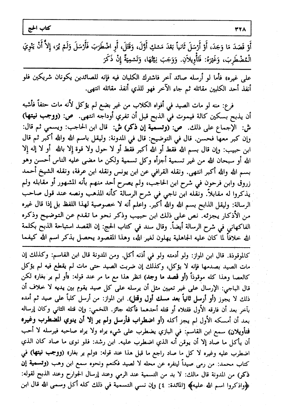 فرع: منه لو مات الصيد في أفواه الكلاب من غير بضع لم يؤكل لأنه مات حتفا فأشبه أن يذبح بسكين كالة فيموت في الذبح قبل أن تفري أوداجه انتهى. ص: "ووجب نيتها" ش: الإجماع على ذلك. ص: "وتسمية إن ذكر" ش: قال ابن الحاجب ويسمي ثم قال وإن كبر معها فحسن. قال في التوضيح قال في المدونة وليقل باسم الله والله أكبر ثم قال ابن حبيب وإن قال بسم الله فقط أو الله أكبر فقط أو لا حول ولا قوة إلا بالله أو لا إله إلا الله أو سبحان الله من غير تسمية أجزأه وكل تسمية ولكن ما مضى عليه الناس أحسن وهو بسم الله والله أكبر انتهى. ونقله القرافي عن ابن يونس ونقله ابن عرفة ونقله الشيخ أحمد زروق وابن فرحون في شرح ابن الحاجب ولم يصرح أحد منهم بأنه المشهور أو مقابله ولم يذكروا له مقابلا. ونقله ابن ناجي في شرح الرسالة كأنه المذهب ونصه عند قول صاحب الرسالة وليقل الذابح بسم الله والله أكبر. واعلم أنه لا خصوصية لهذا اللفظ بل إذا قال غيره من الأذكار يجزئه. نص على ذلك ابن حبيب وذكر نحو ما تقدم عن التوضيح وذكره الفاكهاني في شرح الرسالة أيضا. وقال سند في كتاب الحج إن القصد استباحة الذبح بكلمة الله خلافا لما كان عليه الجاهلية يهلون لغير الله وهذا المقصود يحصل بذكر اسم الله كيفما