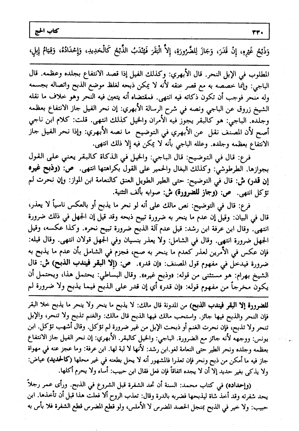 فرع: قال في التوضيح قال الباجي والخيل في الذكاة كالبقر يعني على القول بجوازها. الطرطوشي وكذلك البغال والحمير على القول بكراهتها انتهى. ص: "وذبح غيره إن قدر" ش: قال في التوضيح حتى الطير الطويل العنق كالنعامة ابن المواز وإن نحرت لم تؤكل انتهى. ص: "وجاز للضرورة" ش: صوابه بألف التثنية.