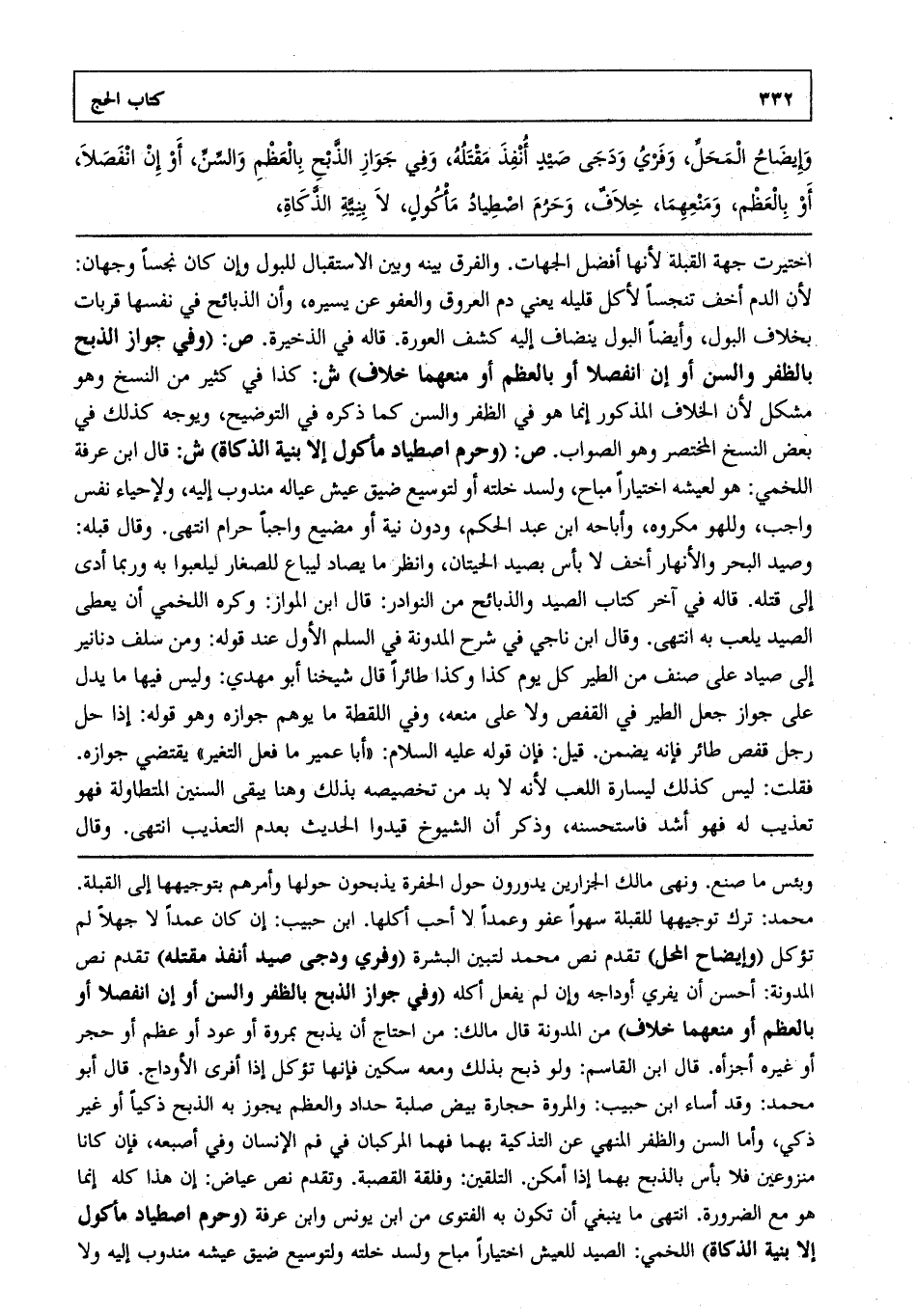وإيضاح المحل وفري ودجى صيد أنفذ مقتله وفي جواز الذبح بالعظم والسن أو إن انفصلا أو بالعظم ومنعهما خلاف وحرم اصطياد مأكول لا بنية الذكاة