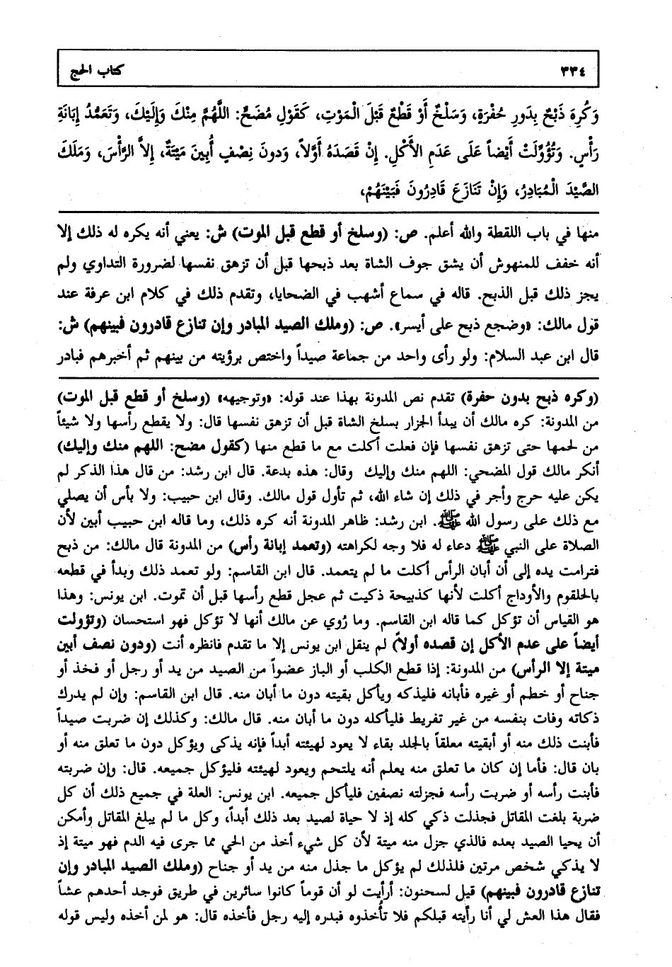 وكره ذبح بدور حفرة وسلخ أو قطع قبل الموت كقول مضح اللهم منك وإليك وتعمد إبانة رأس وتؤولت أيضا على عدم الأكل إن قصده أولا ودون نصف أبين ميتة إلا الرأس وملك الصيد المبادر وإن تنازع قادرون فبينهم
