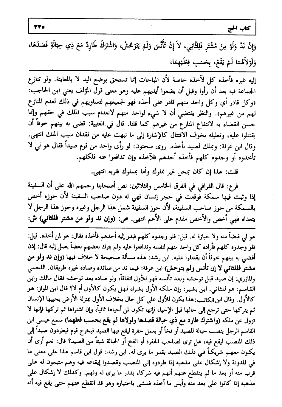 إليه غيره فأخذه كل لآخذه خاصة لأن المباحات إنما تستحق بوضع اليد لا بالمعاينة. ولو تنازع الجماعة فيه بعد أن رأوا وقبل أن يضعوا أيديهم عليه وهو معنى قول المؤلف يعني ابن الحاجب "وكل قادر أي وكل واحد منهم قادر على أخذه فهو لجميعهم لتساويهم في ذلك لعدم المنازع لهم من غيرهم". والنظر يقتضي أن لا شيء لواحد منهم لانعدام سبب الملك في حقهم وإنما حسن القضاء به لانتفاع المنازع من غيرهم كما قلنا. قال في العتبية قضى به بينهم خوفا أن يقتتلوا عليه وتعليله بخوف الاقتتال كالإشارة إلى ما نبهت عليه من فقدان سبب الملك انتهى. وقال ابن عرفة ويملك لصيد بأخذه. روى سحنون لو رأى واحد من قوم صيدا فقال هو لي لا تأخذوه أو وجدوه كلهم فأخذه أحدهم فلآخذه وإن تدافعوا عنه فلكلهم.