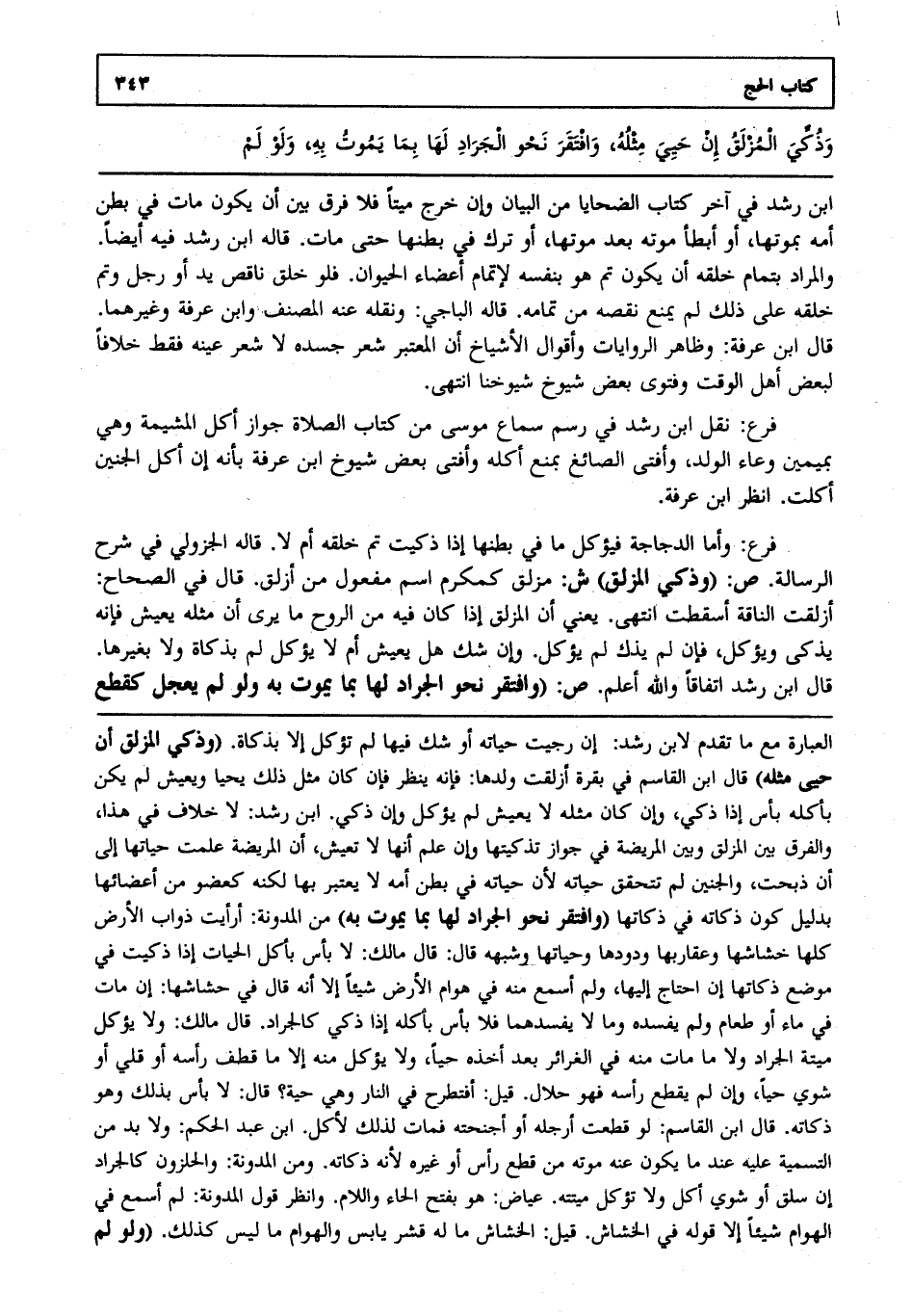 ابن رشد في آخر كتاب الضحايا من البيان وإن خرج ميتا فلا فرق بين أن يكون مات في بطن أمه بموتها أو أبطأ موته بعد موتها أو ترك في بطنها حتى مات. قاله ابن رشد فيه أيضا. والمراد بتمام خلقه أن يكون تم هو بنفسه لإتمام أعضاء الحيوان. فلو خلق ناقص يد أو رجل وتم خلقه على ذلك لم يمنع نقصه من تمامه. قاله الباجي ونقله عنه المصنف وابن عرفة وغيرهما. قال ابن عرفة وظاهر الروايات وأقوال الأشياخ أن المعتبر شعر جسده لا شعر عينه فقط خلافا لبعض أهل الوقت وفتوى بعض شيوخ شيوخنا انتهى. فرع: نقل ابن رشد في رسم سماع موسى من كتاب الصلاة جواز أكل المشيمة وهي بميمين وعاء الولد وأفتى الصائغ بمنع أكله وأفتى بعض شيوخ ابن عرفة بأنه إن أكل الجنين أكلت. انظر ابن عرفة.