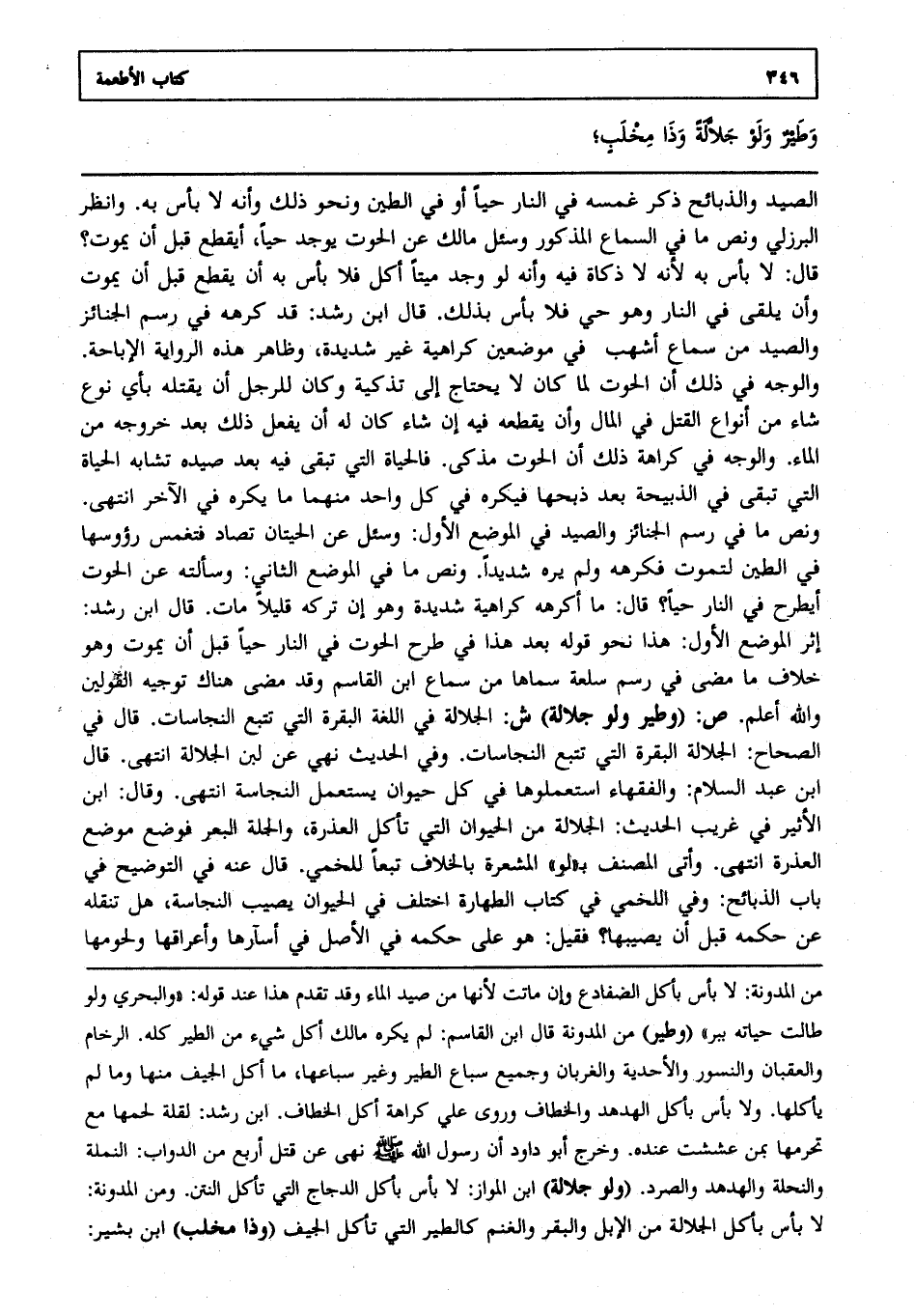 الصيد والذبائح ذكر غمسه في النار حيا أو في الطين ونحو ذلك وأنه لا بأس به. وانظر البرزلي ونص ما في السماع المذكور وسئل مالك عن الحوت يوجد حيا أيقطع قبل أن يموت قال لا بأس به لأنه لا ذكاة فيه وأنه لو وجد ميتا أكل فلا بأس به أن يقطع قبل أن يموت وأن يلقى في النار وهو حي فلا بأس بذلك. قال ابن رشد قد كرهه في رسم الجنائز والصيد من سماع أشهب في موضعين كراهية غير شديدة وظاهر هذه الرواية الإباحة. والوجه في ذلك أن الحوت لما كان لا يحتاج إلى تذكية وكان للرجل أن يقتله بأي نوع شاء من أنواع القتل في المال وأن يقطعه فيه إن شاء كان له أن يفعل ذلك بعد خروجه من الماء. والوجه في كراهة ذلك أن الحوت مذكى. فالحياة التي تبقى فيه بعد صيده تشابه الحياة التي تبقى في الذبيحة بعد ذبحها فيكره في كل واحد منهما ما يكره في الآخر انتهى. ونص ما في رسم الجنائز والصيد في الموضع الأول وسئل عن الحيتان تصاد فتغمس رؤوسها في الطين لتموت فكرهه ولم يره شديدا ونص ما في الموضع الثاني وسألته عن الحوت أيطرح في النار حيا قال ما أكرهه كراهية شديدة وهو إن تركه قليلا مات. قال ابن رشد إثر الموضع الأول هذا نحو قوله بعد هذا في طرح الحوت في النار حيا قبل أن يموت وهو خلاف ما مضى في رسم سلعة سماها من سماع ابن القاسم وقد مضى هناك توجيه القولين والله أعلم. ص: "وطير ولو جلالة" ش: الجلالة في اللغة البقرة التي تتبع النجاسات. قال في الصحاح الجلالة البقرة التي تتبع النجاسات. وفي الحديث نهي عن لبن الجلالة انتهى. قال ابن عبد السلام والفقهاء استعملوها في كل حيوان يستعمل النجاسة انتهى. وقال ابن الأثير في غريب الحديث الجلالة من الحيوان التي تأكل العذرة والجلة البعر فوضع موضع العذرة انتهى. وأتى المصنف بلو المشعرة بالخلاف تبعا للخمي. قال عنه في التوضيح في باب الذبائح وفي اللخمي في كتاب الطهارة اختلف في الحيوان يصيب النجاسة هل تنقله عن حكمه قبل أن يصيبها فقيل هو على حكمه في الأصل في أسآرها وأعراقها ولحومها