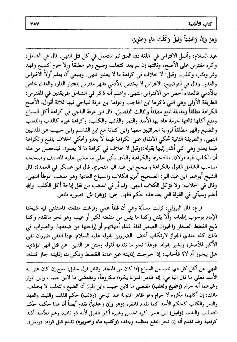 عبد السلام وأصل الافتراس في اللغة دق العنق ثم استعمل في كل قتل انتهى. قال في الشامل وكره مفترس على الأصح وثالثها إن لم يعد كثعلب وضبع وهر مطلقا وإلا حرم كسبع وفهد ونمر وذئب وكلب. وقيل لا خلاف في كراهة ما لا يعدو انتهى. وينبغي أن يعلم أولا الافتراس والعدو. وقال في التوضيح الافتراس لا يختص بالآدمي فالهر مفترس باعتبار الفار والعداء خاص بالآدمي فالعداء أخص من الافتراس انتهى. واعلم أنه ذكر في الشامل طريقتين في المفترس الطريقة الأولى وهي التي ذكرها ابن الحاجب وعزاها ابن عرفة للباجي فيها ثلاثة أقوال الأصح الكراهة مطلقا ومقابلة المنع مطلقا والثالث التفصيل. قال ابن عرفة الباجي في كراهة ومنع أكلها ثالثها حرمة عاد بها الأسد والنمر والذئب والكلب وكراهة غيره كالدب والثعلب والضبع والهر مطلقا لرواية العراقيين معها وابن كنانة مع ابن القاسم وابن حبيب عن المدنيين انتهى. والطريقة الثانية تحكي الاتفاق على الكراهة فيما لا يعدو وتحكي الخلاف بالمنع والكراهة فيما يعدو وهي التي أشار إليها بقوله "وقيل لا خلاف في كراهة ما لا يعدو". فيتحصل من هذا أن الكلب فيه قولان بالتحريم والكراهة والذي يأتي على ما مشى عليه المصنف وصححه صاحب الشامل القول بالكراهة وصحح ابن عبد البر التحريم. قال ابن عسكر في العمدة قال الشيخ أبو عمر ابن عبد البر الصحيح تحريم الكلاب والسباع العادية وهو مذهب الموطأ انتهى. وقال في الجلاب ولا تؤكل الكلاب انتهى. ولم أر في المذهب من نقل إباحة أكل الكلب والله أعلم وسيأتي في القولة التي بعد هذه حكم قتلها. ص: "وهر" ش: تصوره ظاهر.