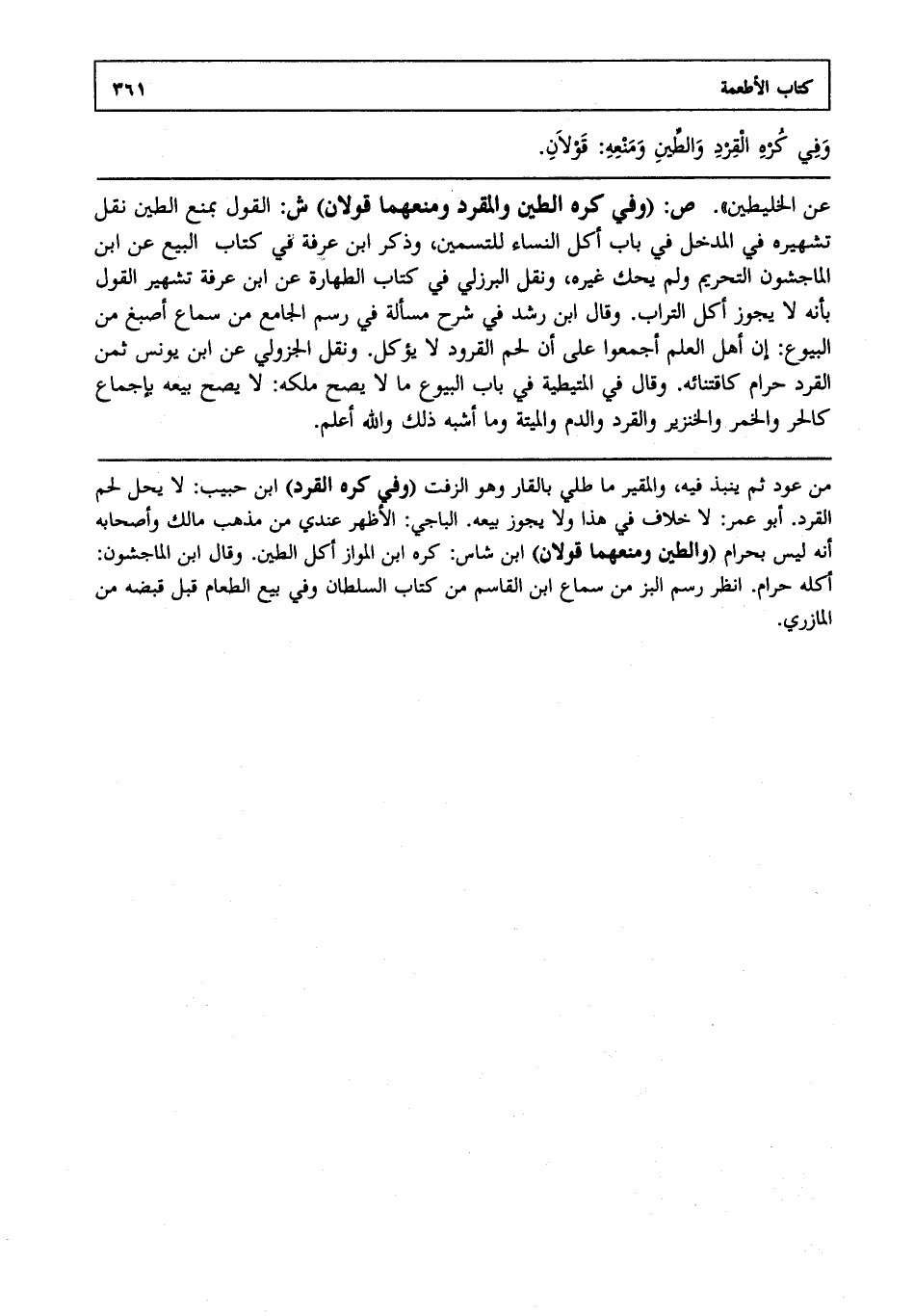 عن الخليطين. ص: "وفي كره الطين والمقرد ومنعهما قولان" ش: القول بمنع الطين نقل تشهيره في المدخل في باب أكل النساء للتسمين وذكر ابن عرفة في كتاب البيع عن ابن الماجشون التحريم ولم يحك غيره ونقل البرزلي في كتاب الطهارة عن ابن عرفة تشهير القول بأنه لا يجوز أكل التراب. وقال ابن رشد في شرح مسألة في رسم الجامع من سماع أصبغ من البيوع إن أهل العلم أجمعوا على أن لحم القرود لا يؤكل. ونقل الجزولي عن ابن يونس ثمن القرد حرام كاقتنائه. وقال في المتيطية في باب البيوع ما لا يصح ملكه لا يصح بيعه بإجماع كالحر والخمر والخنزير والقرد والدم والميتة وما أشبه ذلك والله أعلم.