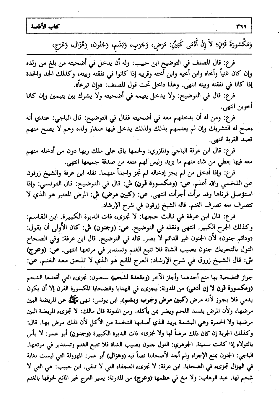 ومكسورة قرن لا إن أدمى كبين مرض وجرب وبشم وجنون وهزال وعرج