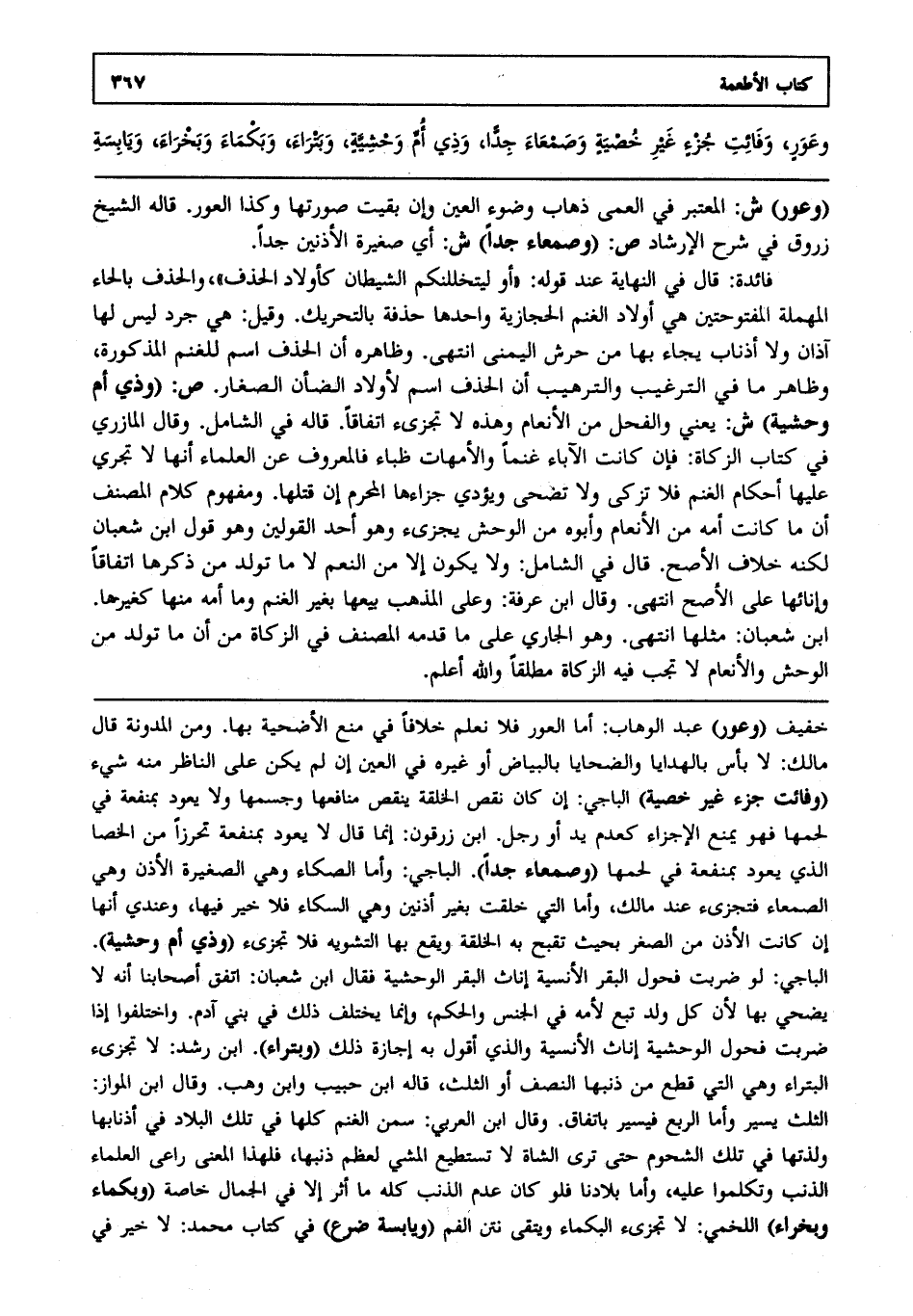 فائدة: قال في النهاية عند قوله "أو ليتخللنكم الشيطان كأولاد الحذف" والحذف بالحاء المهملة المفتوحتين هي أولاد الغنم الحجازية واحدها حذفة بالتحريك. وقيل هي جرد ليس لها آذان ولا أذناب يجاء بها من حرش اليمنى انتهى. وظاهره أن الحذف اسم للغنم المذكورة وظاهر ما في الترغيب والترهيب أن الحذف اسم لأولاد الضأن الصغار. ص: "وذي أم وحشية" ش: يعني والفحل من الأنعام وهذه لا تجزئ اتفاقا. قاله في الشامل. وقال المازري في كتاب الزكاة فإن كانت الآباء غنما والأمهات ظباء فالمعروف عن العلماء أنها لا تجري عليها أحكام الغنم فلا تزكى ولا تضحى ويؤدي جزاءها المحرم إن قتلها. ومفهوم كلام المصنف أن ما كانت أمه من الأنعام وأبوه من الوحش يجزئ وهو أحد القولين وهو قول ابن شعبان لكنه خلاف الأصح. قال في الشامل ولا يكون إلا من النعم لا ما تولد من ذكرها اتفاقا وإناثها على الأصح انتهى. وقال ابن عرفة وعلى المذهب بيعها بغير الغنم وما أمه منها كغيرها. ابن شعبان مثلها انتهى. وهو الجاري على ما قدمه المصنف في الزكاة من أن ما تولد من الوحش والأنعام لا تجب فيه الزكاة مطلقا والله أعلم.