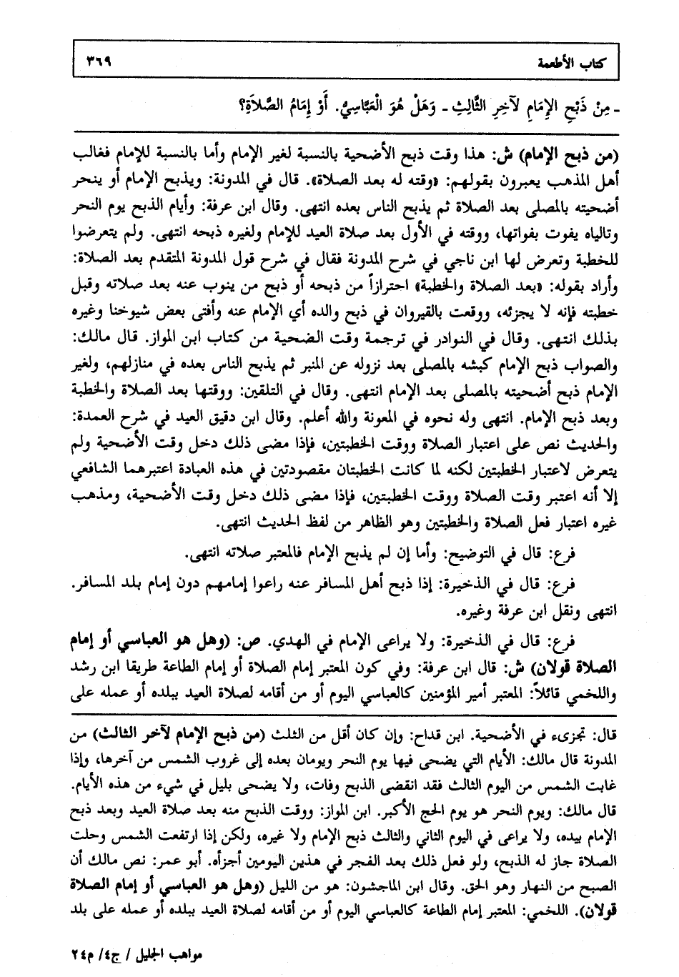 فرع: قال في الذخيرة ولا يراعى الإمام في الهدي. ص: "وهل هو العباسي أو إمام الصلاة قولان" ش: قال ابن عرفة وفي كون المعتبر إمام الصلاة أو إمام الطاعة طريقا ابن رشد واللخمي قائلا المعتبر أمير المؤمنين كالعباسي اليوم أو من أقامه لصلاة العيد ببلده أو عمله على