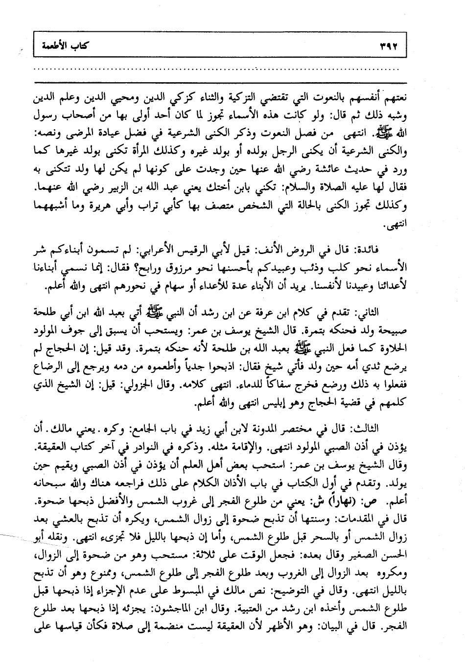 الثالث: قال في مختصر المدونة لابن أبي زيد في باب الجامع وكره يعني مالك أن يؤذن في أذن الصبي المولود انتهى. والإقامة مثله. وذكره في النوادر في آخر كتاب العقيقة. وقال الشيخ يوسف بن عمر استحب بعض أهل العلم أن يؤذن في أذن الصبي ويقيم حين يولد. وتقدم في أول الكتاب في باب الأذان الكلام على ذلك فراجعه هناك والله سبحانه أعلم. ص: "نهارا" ش: يعني من طلوع الفجر إلى غروب الشمس والأفضل ذبحها ضحوة. قال في المقدمات وسنتها أن تذبح ضحوة إلى زوال الشمس ويكره أن تذبح بالعشي بعد زوال الشمس أو بالسحر قبل طلوع الشمس وأما إن ذبحها بالليل فلا تجزئ انتهى. ونقله أبو الحسن الصغير وقال بعده فجعل الوقت على ثلاثة مستحب وهو من ضحوة إلى الزوال ومكروه بعد الزوال إلى الغروب وبعد طلوع الفجر إلى طلوع الشمس وممنوع وهو أن تذبح بالليل انتهى. وقال في التوضيح نص مالك في المبسوط على عدم الإجزاء إذا ذبحها قبل طلوع الشمس وأخذه ابن رشد من العتبية. وقال ابن الماجشون يجزئه إذا ذبحها بعد طلوع الفجر. قال في البيان وهو الأظهر لأن العقيقة ليست منضمة إلى صلاة فكأن قياسها على