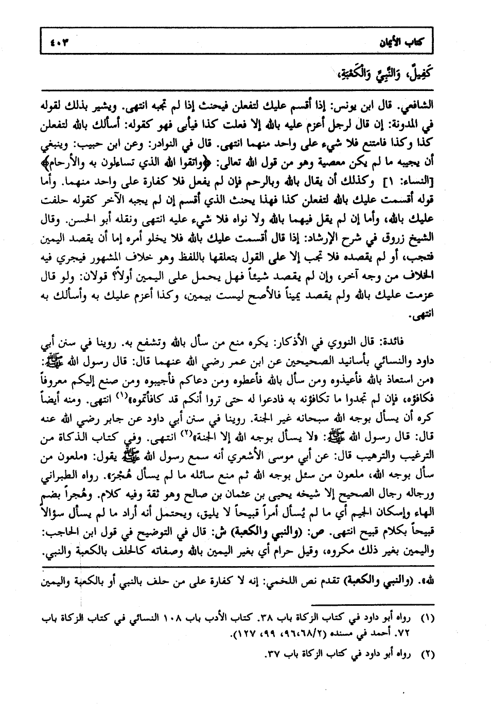 فائدة: قال النووي في الأذكار يكره منع من سأل بالله وتشفع به. روينا في سنن أبي داود والنسائي بأسانيد الصحيحين عن ابن عمر رضي الله عنهما قال قال رسول الله صلى الله عليه وسلم "من استعاذ بالله فأعيذوه ومن سأل بالله فأعطوه ومن دعاكم فأجيبوه ومن صنع إليكم معروفا فكافؤه فإن لم تجدوا ما تكافؤنه به فادعوا له حتى تروا أنكم قد كافأتموه"1 انتهى. ومنه أيضا كره أن يسأل بوجه الله سبحانه غير الجنة. روينا في سنن أبي داود عن جابر رضي الله عنه قال قال رسول الله صلى الله عليه وسلم "لا يسأل بوجه الله إلا الجنة"2 انتهى. وفي كتاب الذكاة من الترغيب والترهيب قال عن أبي موسى الأشعري أنه سمع رسول الله صلى الله عليه وسلم يقول "ملعون من سأل بوجه الله ملعون من سئل بوجه الله ثم منع سائله ما لم يسأل هجر". رواه الطبراني ورجاله رجال الصحيح إلا شيخه يحيى بن عثمان بن صالح وهو ثقة وفيه كلام. وهجرا بضم الهاء وإسكان الجيم أي ما لم يسأل أمرا قبيحا لا يليق ويحتمل أنه أراد ما لم يسأل سؤالا قبيحا بكلام قبيح انتهى. ص: "والنبي والكعبة" ش: قال في التوضيح في قول ابن الحاجب واليمين بغير ذلك مكروه وقيل حرام أي بغير اليمين بالله وصفاته كالحلف بالكعبة والنبي.
