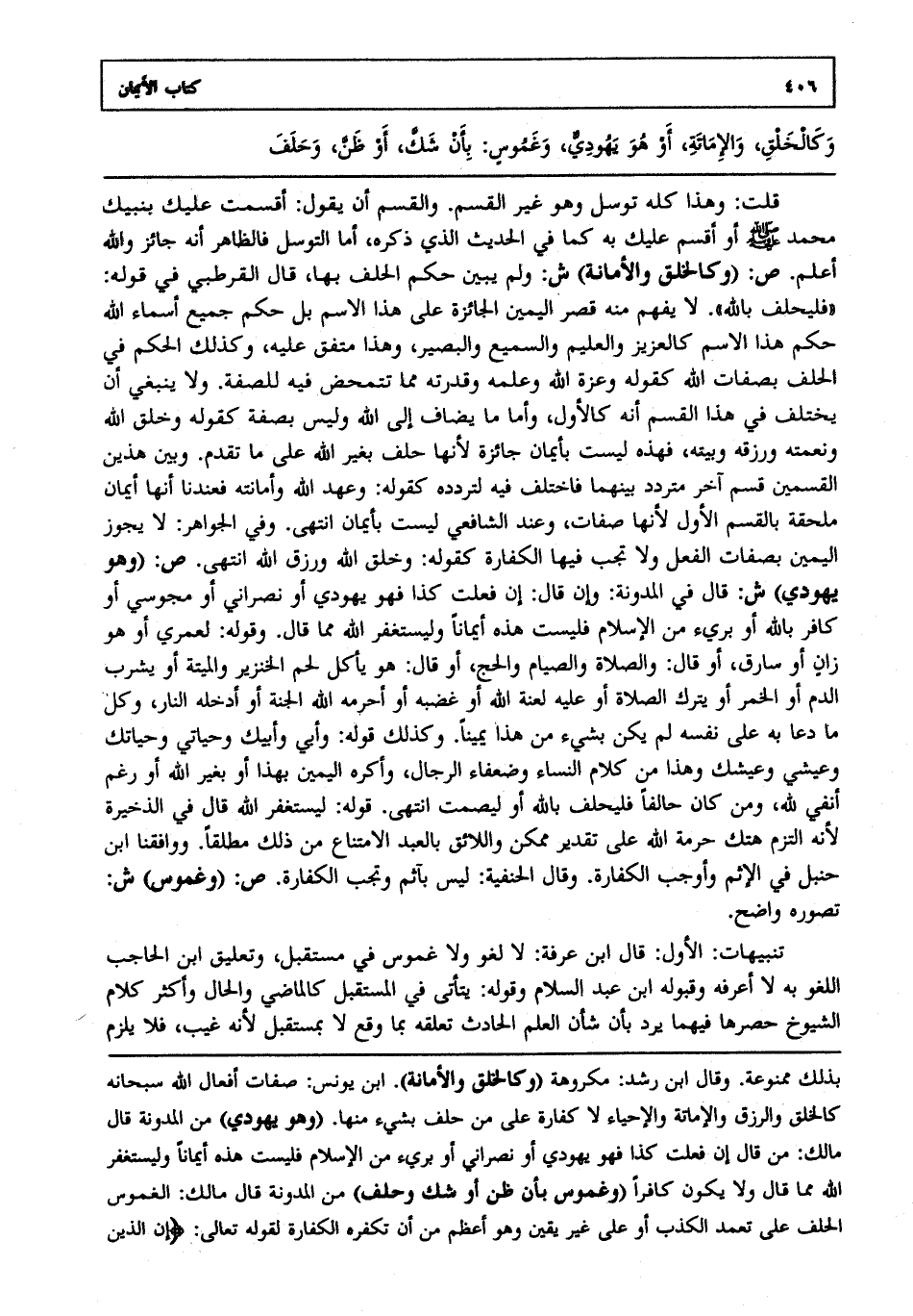 قلت: وهذا كله توسل وهو غير القسم. والقسم أن يقول أقسمت عليك بنبيك محمد صلى الله عليه وسلم أو أقسم عليك به كما في الحديث الذي ذكره أما التوسل فالظاهر أنه جائز والله أعلم. ص: "وكالخلق والأمانة" ش: ولم يبين حكم الحلف بها قال القرطبي في قوله فليحلف بالله. لا يفهم منه قصر اليمين الجائزة على هذا الاسم بل حكم جميع أسماء الله حكم هذا الاسم كالعزيز والعليم والسميع والبصير وهذا متفق عليه وكذلك الحكم في الحلف بصفات الله كقوله وعزة الله وعلمه وقدرته مما تتمحض فيه للصفة. ولا ينبغي أن يختلف في هذا القسم أنه كالأول وأما ما يضاف إلى الله وليس بصفة كقوله وخلق الله ونعمته ورزقه وبيته فهذه ليست بأيمان جائزة لأنها حلف بغير الله على ما تقدم. وبين هذين القسمين قسم آخر متردد بينهما فاختلف فيه لتردده كقوله وعهد الله وأمانته فعندنا أنها أيمان ملحقة بالقسم الأول لأنها صفات وعند الشافعي ليست بأيمان انتهى. وفي الجواهر لا يجوز اليمين بصفات الفعل ولا تجب فيها الكفارة كقوله وخلق الله ورزق الله انتهى. ص: "وهو يهودي" ش: قال في المدونة وإن قال إن فعلت كذا فهو يهودي أو نصراني أو مجوسي أو كافر بالله أو بريء من الإسلام فليست هذه أيمانا وليستغفر الله مما قال. وقوله لعمري أو هو زان أو سارق أو قال والصلاة والصيام والحج أو قال هو يأكل لحم الخنزير والميتة أو يشرب الدم أو الخمر أو يترك الصلاة أو عليه لعنة الله أو غضبه أو أحرمه الله الجنة أو أدخله النار وكل ما دعا به على نفسه لم يكن بشيء من هذا يمينا. وكذلك قوله وأبي وأبيك وحياتي وحياتك وعيشي وعيشك وهذا من كلام النساء وضعفاء الرجال وأكره اليمين بهذا أو بغير الله أو رغم أنفي لله ومن كان حالفا فليحلف بالله أو ليصمت انتهى. قوله ليستغفر الله قال في الذخيرة لأنه التزم هتك حرمة الله على تقدير ممكن واللائق بالعبد الامتناع من ذلك مطلقا. ووافقنا ابن حنبل في الإثم وأوجب الكفارة. وقال الحنفية ليس بآثم وتجب الكفارة. ص: "وغموس" ش: تصوره واضح.