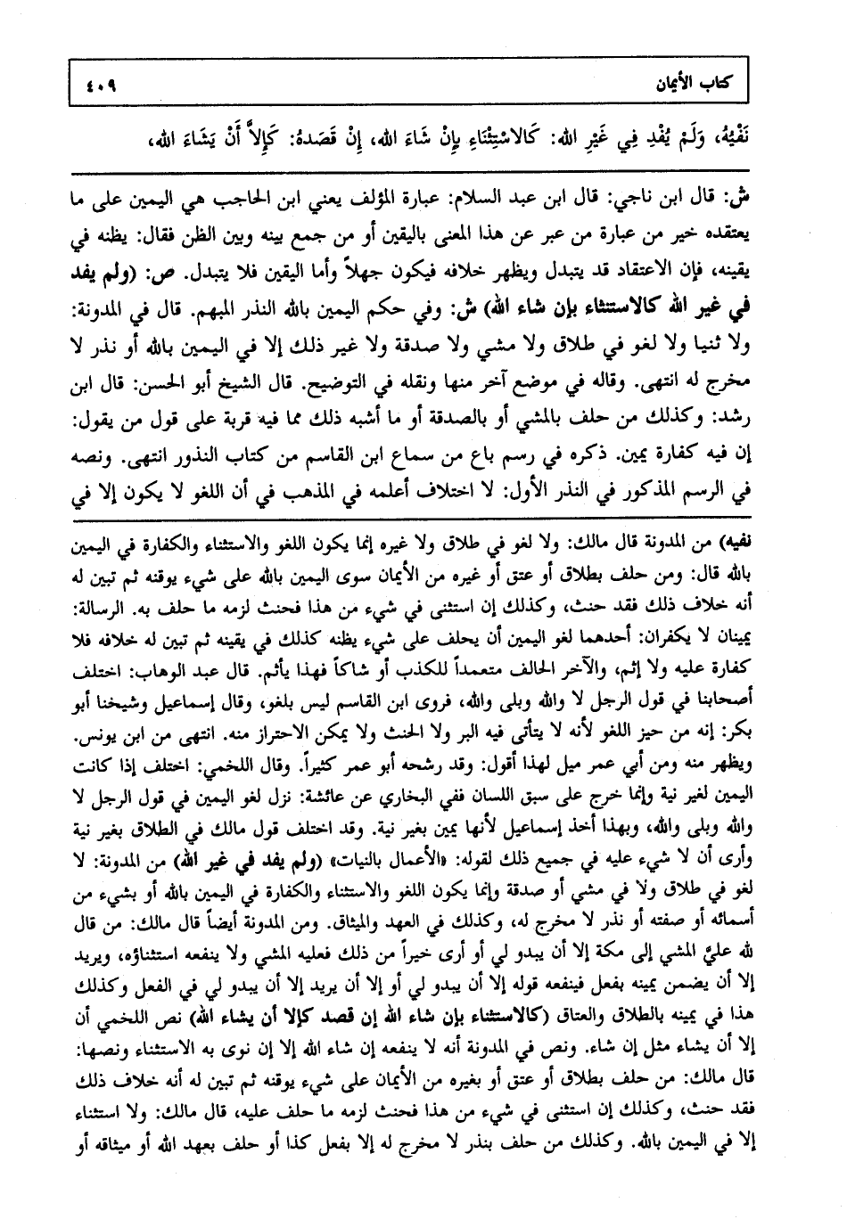 ش: قال ابن ناجي قال ابن عبد السلام عبارة المؤلف يعني ابن الحاجب هي اليمين على ما يعتقده خير من عبارة من عبر عن هذا المعنى باليقين أو من جمع بينه وبين الظن فقال يظنه في يقينه فإن الاعتقاد قد يتبدل ويظهر خلافه فيكون جهلا وأما اليقين فلا يتبدل. ص: "ولم يفد في غير الله كالاستنثاء بإن شاء الله" ش: وفي حكم اليمين بالله النذر المبهم. قال في المدونة ولا ثنيا ولا لغو في طلاق ولا مشي ولا صدقة ولا غير ذلك إلا في اليمين بالله أو نذر لا مخرج له انتهى. وقاله في موضع آخر منها ونقله في التوضيح. قال الشيخ أبو الحسن قال ابن رشد وكذلك من حلف بالمشي أو بالصدقة أو ما أشبه ذلك مما فيه قربة على قول من يقول إن فيه كفارة يمين. ذكره في رسم باع من سماع ابن القاسم من كتاب النذور انتهى. ونصه في الرسم المذكور في النذر الأول لا اختلاف أعلمه في المذهب في أن اللغو لا يكون إلا في
