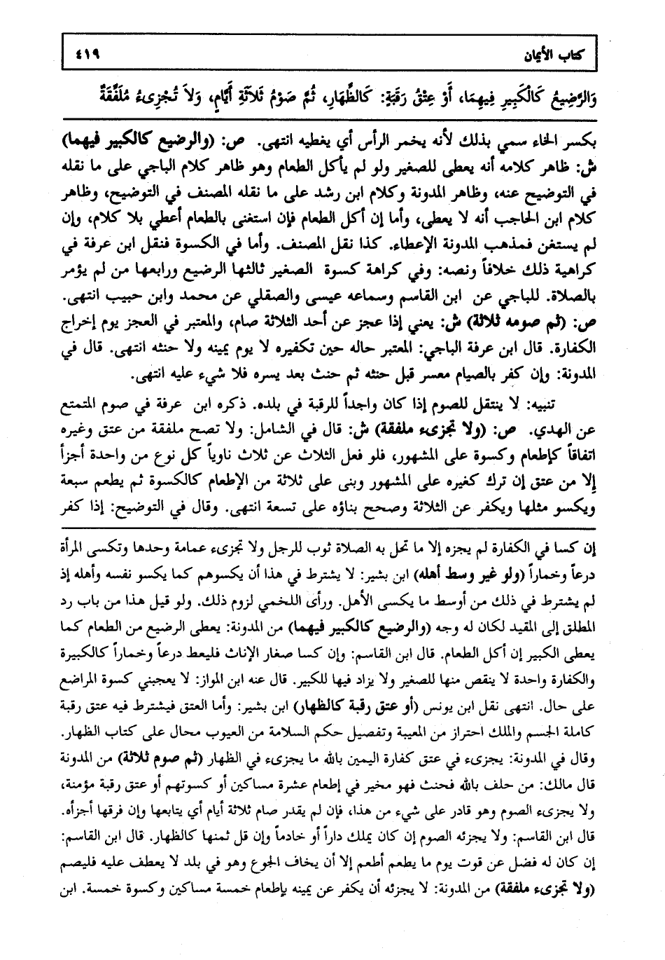 بكسر الخاء سمي بذلك لأنه يخمر الرأس أي يغطيه انتهى. ص: "والرضيع كالكبير فيهما" ش: ظاهر كلامه أنه يعطى للصغير ولو لم يأكل الطعام وهو ظاهر كلام الباجي على ما نقله في التوضيح عنه وظاهر المدونة وكلام ابن رشد على ما نقله المصنف في التوضيح وظاهر كلام ابن الحاجب أنه لا يعطى وأما إن أكل الطعام فإن استغنى بالطعام أعطي بلا كلام وإن لم يستغن فمذهب المدونة الإعطاء. كذا نقل المصنف. وأما في الكسوة فنقل ابن عرفة في كراهية ذلك خلافا ونصه وفي كراهة كسوة الصغير ثالثها الرضيع ورابعها من لم يؤمر بالصلاة. للباجي عن ابن القاسم وسماعه عيسى والصقلي عن محمد وابن حبيب انتهى. ص: "ثم صومه ثلاثة" ش: يعني إذا عجز عن أحد الثلاثة صام والمعتبر في العجز يوم إخراج الكفارة. قال ابن عرفة الباجي المعتبر حاله حين تكفيره لا يوم يمينه ولا حنثه انتهى. قال في المدونة وإن كفر بالصيام معسر قبل حنثه ثم حنث بعد يسره فلا شيء عليه انتهى.