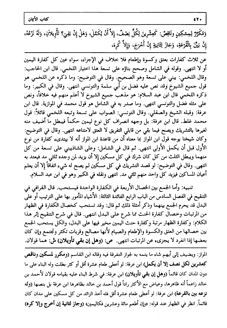 عن ثلاث كفارات بعتق وكسوة وإطعام فلا خلاف في الإجزاء سواء عين كل كفارة اليمين أو لا انتهى. وقوله في الشامل وصحح بناؤه على تسعة هذا اختيار اللخمي. قال ابن الحاجب وقال اللخمي يبني على تسعة وهو الصحيح. وقال في التوضيح وما ذكره عن اللخمي هو قول جميع الشيوخ وقد نص عليه فضل بن أبي سلمة والتونسي انتهى. وقال في الكبير وما ذكره اللخمي قال ابن عبد السلام هو مذهب جميع الشيوخ لا أعلم منهم فيه خلافا ونص على مثله فضل والتونسي انتهى. وما صدر به في الشامل هو قول محمد في الموازية. قال ابن عرفة وقبله الشيخ والصقلي. وقال التونسي الصواب على تسعة وتبعه اللخمي قائلا قول محمد غلط. قال ابن عرفة بل وجهه انصراف كل نوع ليمين حكما فيبطل ما أضيف منه لغيرها بالتشريك ويصح فيما بقي من قابلي التفريق لا العتق لامتناعه انتهى. وقال في التوضيح وكان شيخنا يوجه قول ابن المواز بما معناه أن من قاعدة ابن المواز أنه لا يبتدئ كفارة من نوع الأول قبل أن يكمل الأولى انتهى. ثم قال في الشامل وعلى الشاذ يبني على تسعة من كل منهما ويبطل الثلث من كل كان شرك في كل مسكين إلا أن يزيد لمن وجده ثلثي مد فيعتد به انتهى. وقال في التوضيح لو قصد التشريك في كل مسكين لم يصح له شيء اتفاقا إلا أن يعلم أعيان المساكين فيزيد كل واحد منهم ثلثي مد. انتهى ونقله في الكبير وهو في ابن عبد السلام.