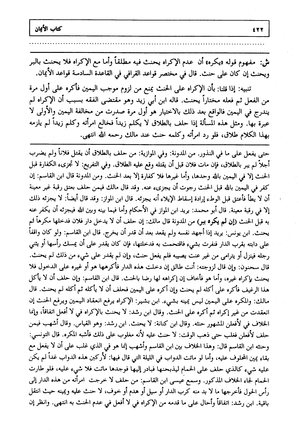 ش: مفهوم قوله يكره أن عدم الإكراه يحنث فيه مطلقا وأما مع الإكراه فلا يحنث بالبر ويحنث إن كان على حنث. قال في مختصر قواعد القرافي في القاعدة السادسة قواعد الأيمان.