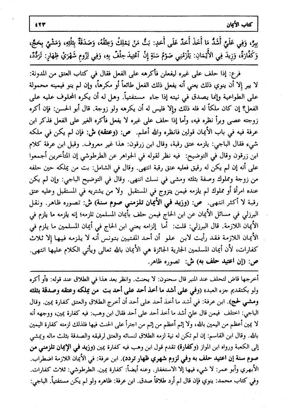 ببر وفي علي أشد ما أخذ أحد على أحد بت من يملك وعتقه وصدقة بثلثه ومشي بحج وكفارة وزيد في الأيمان يلزمني صوم سنة إن اعتيد حلف به وفي لزوم شهري ظهار تردد
