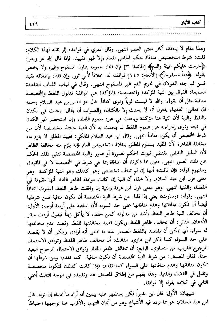 وهذا مقام لا يحققه أكثر مفتي العصر انتهى. وقال المقري في قواعده إثر نقله لهذا الكلام قلت: شرط التخصيص منافاة حكم الخاص للعام وإلا فهو تقييد. فإذا قال الله عز وجل {حُرِّمَتْ عَلَيْكُمُ الْمَيْتَةُ وَالدَّمُ} [المائدة: من الآية3] فإن قلنا بعمومه يتناول المسفوح وغيره ولا يختص بقوله {دَماً مَسْفُوحاً} [الأنعام: من الآية145] لموافقته له خلافا لأبي ثور. وإن قلنا بإطلاقه تقيد فمن ثم جاء القولان في تحريم الدم غير المسفوح انتهى. وقال في لباب اللباب القاعدة السابعة الفرق بين النية المؤكدة والمخصصة فالمؤكدة هي الموافقة لمدلول اللفظ والمخصصة منافية مثل أن يقول والله لا لبست ثوبا ونوى كتانا. قال عز الدين بن عبد السلام رحمه الله تعالى الفقهاء يفتون أنه لا يحنث إلا بالكتان والصواب أن يقال يحنث في الكتان باللفظ والنية لأن النية هنا مؤكدة ويحنث في غيره بعموم اللفظ وإن استحضر غير الكتان في نيته ونوى إخراجه عن عموم اللفظ لم يحنث به لأن النية حينئذ مخصصة لأن من شرط المخصص أن يكون منافيا انتهى. وقال ابن عبد السلام المالكي تقييد المطلق لا يلزم منه مخالفة الظاهر لأن المقيد يستلزم المطلق بخلاف تخصيص العام فإنه يلزم منه مخالفة الظاهر لأن الدليل اللفظي يقتضي ثبوت الحكم لصورة أو صور والنية المخصصة تنفي ذلك الحكم عن تلك الصور انتهى. فتبين مما ذكرناه أن المنافاة إنما هي شرط في المخصصة لا في المقيدة ومفهوم قوله "إن نافت" أنها إن لم تناف تخصص وهو كذلك وهو النية المؤكدة وهو معنى قول ابن عبد السلام. ولا خفاء أن النية إن كانت موافقة لظاهر اللفظ أنها مقبولة في القضاء والفتيا انتهى. وهو معنى قول ابن عرفة والنية إن وافقت ظاهر اللفظ اعتبرت اتفاقا انتهى. وقوله "وساوت" يعني إذا قلنا من شرط النية المخصصة أن تكون منافية فمن شرطها أيضا أن تكون منافاتها وعدم منافاتها على حد السواء لأن المنافية على أربعة أوجه الأول أن تخالف النية ظاهر اللفظ بأشد من مدلوله كمن حلف لا يأكل زيتا فيقول أردت سائر الأدهان. الثاني: أن تخالف ظاهر اللفظ ويكون قصد مخالفتها اللفظ وقصد عدم مخالفتها له سواء أي يمكن أن يقصد باللفظ الصادر عنه ما ادعى أنه أراده ويمكن أن لا يقصد على حد السواء كما ذكر ابن غازي. الثالث: أن تخالف ظاهر اللفظ وتوافق الاحتمال المرجوح القريب من التساوي. الرابع: أن تخالف ظاهر اللفظ وتوافق الاحتمال المرجوح البعيد جدا. فقال المصنف من شرط النية المخصصة أن تكون منافية كما تقدم ومن شرطها أن تكون منافاتها وعدم منافاتها على السواء كما تقدم فإذا كانت كذلك فتكون مخصصة وتقبل في القضاء والفتيا. وهذا يفهم من إطلاق المصنف هنا وتقييده في الوجه الثالث أعني الثاني في كلامه بقوله إلا لموافقة.