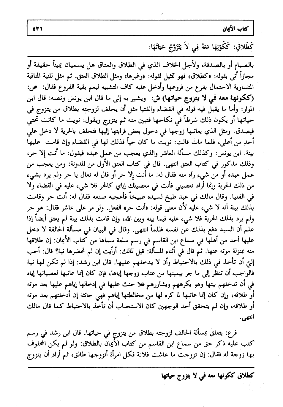 بالصيام أو بالصدقة ولأجل الخلاف الذي في الطلاق والعتاق هل يسميان يمينا حقيقة أو مجازا أتى بقوله كطلاق فهو تمثيل لقوله "وغيرها" ومثل الطلاق العتق. ثم مثل للنية المنافية المتساوية الاحتمال بفرع من فروعها وأدخل عليه كاف التشبيه ليعم بقية الفروع فقال ص: "ككونها معه في لا يتزوج حياتها" ش: ويشير به إلى ما قال ابن يونس ونصه قال ابن المواز وأما ما يقبل فيه قوله في القضاء والفتيا مثل أن يحلف لزوجته بطلاق من يتزوج في حياتها أو يكون ذلك شرطا في نكاحها فتبين منه ثم يتزوج ويقول نويت ما كانت تحتي فيصدق. ومثل الذي يعاتبها زوجها في دخول بعض قرابتها إليها فتحلف بالحرية لا دخل علي أحد من أعلى فلما مات قالت نويت ما كان حيا فذلك لها في القضاء وإن قامت عليها بينة. ابن يونس وكذلك مسألة العاشر والذي يعجب من عمل عبده فيقول ما أنت إلا حر وذلك مذكور في كتاب العتق انتهى. قال في كتاب العتق الأول من المدونة ومن يعجب من عمل عبده أو من شيء رآه منه فقال له ما أنت إلا حر أو قال له تعال يا حر ولم يرد بشيء من ذلك الحرية وإنما أراد تعصيني فأنت في معصيتك إياي كالحر فلا شيء عليه في القضاء ولا في الفتيا. وقال مالك في عبد طبخ لسيده طبيخا فأعجبه صنعه فقال له أنت حر وقامت بذلك بينة أنه لا شيء عليه لأن معنى قوله "أنت حر" الفعل. ولو مر على عاشر فقال هو حر ولم يرد بذلك الحرية فلا شيء عليه فيما بينه وبين الله وإن قامت بذلك بينة لم يعتق أيضا إذا علم أن السيد دفع بذلك عن نفسه ظلما انتهى. وقال في البيان في مسألة الحالفة لا دخل عليها أحد من أهلها في سماع ابن القاسم في رسم سلعة سماها من كتاب الأيمان إن طلاقها منه بمنزلة موته عنها. ثم قال في أثناء المسألة قيل لمالك أرأيت إن لم تحضرها نية قال أحب إلي أن تأخذ في ذلك بالاحتياط وأن لا يدخلهم عليها. قال ابن رشد إذا لم تكن لها نية فالواجب أن تنظر إلى ما جر بيمينها من عتاب زوجها إياها فإن كان إنما عاتبها لعصيانها إياه في أن تدخلهم بيتها وهو يكرههم ويشاررهم فلا حنث عليها في إدخالها إياهم عليها بعد موته أو طلاقه وإن كان إنما عاتبها لما كره لها من مخالطتها إياهم فهي حانثة إن أدخلتهم بعد موته أو طلاقه وإن لم يتحقق أحد الوجهين كان الاستحباب أن تأخذ بالاحتياط كما قال مالك انتهى.