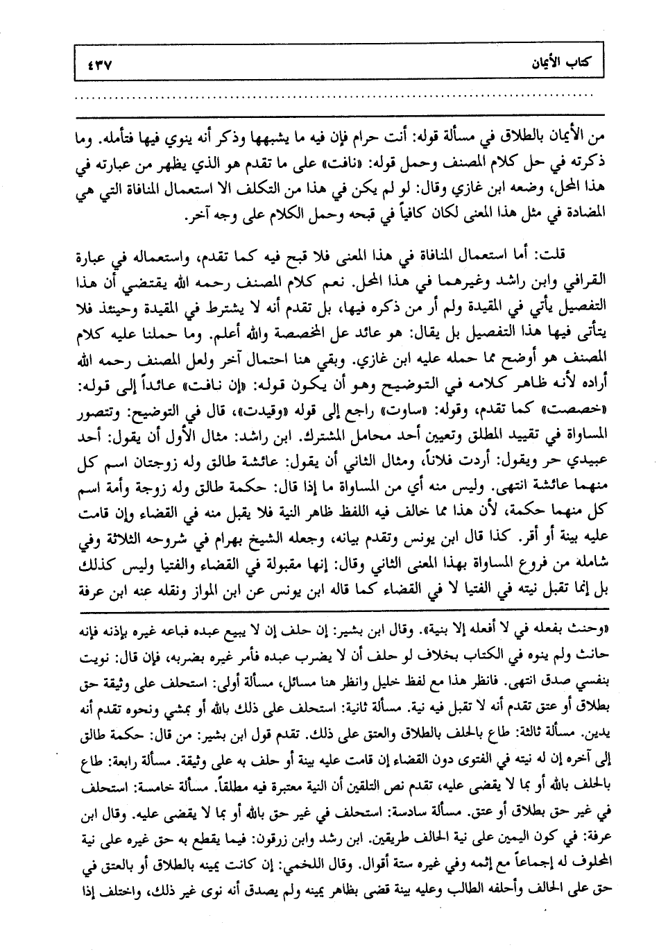 من الأيمان بالطلاق في مسألة قوله أنت حرام فإن فيه ما يشبهها وذكر أنه ينوي فيها فتأمله. وما ذكرته في حل كلام المصنف وحمل قوله نافت على ما تقدم هو الذي يظهر من عبارته في هذا المحل وضعه ابن غازي وقال لو لم يكن في هذا من التكلف الا استعمال المنافاة التي هي المضادة في مثل هذا المعنى لكان كافيا في قبحه وحمل الكلام على وجه آخر.