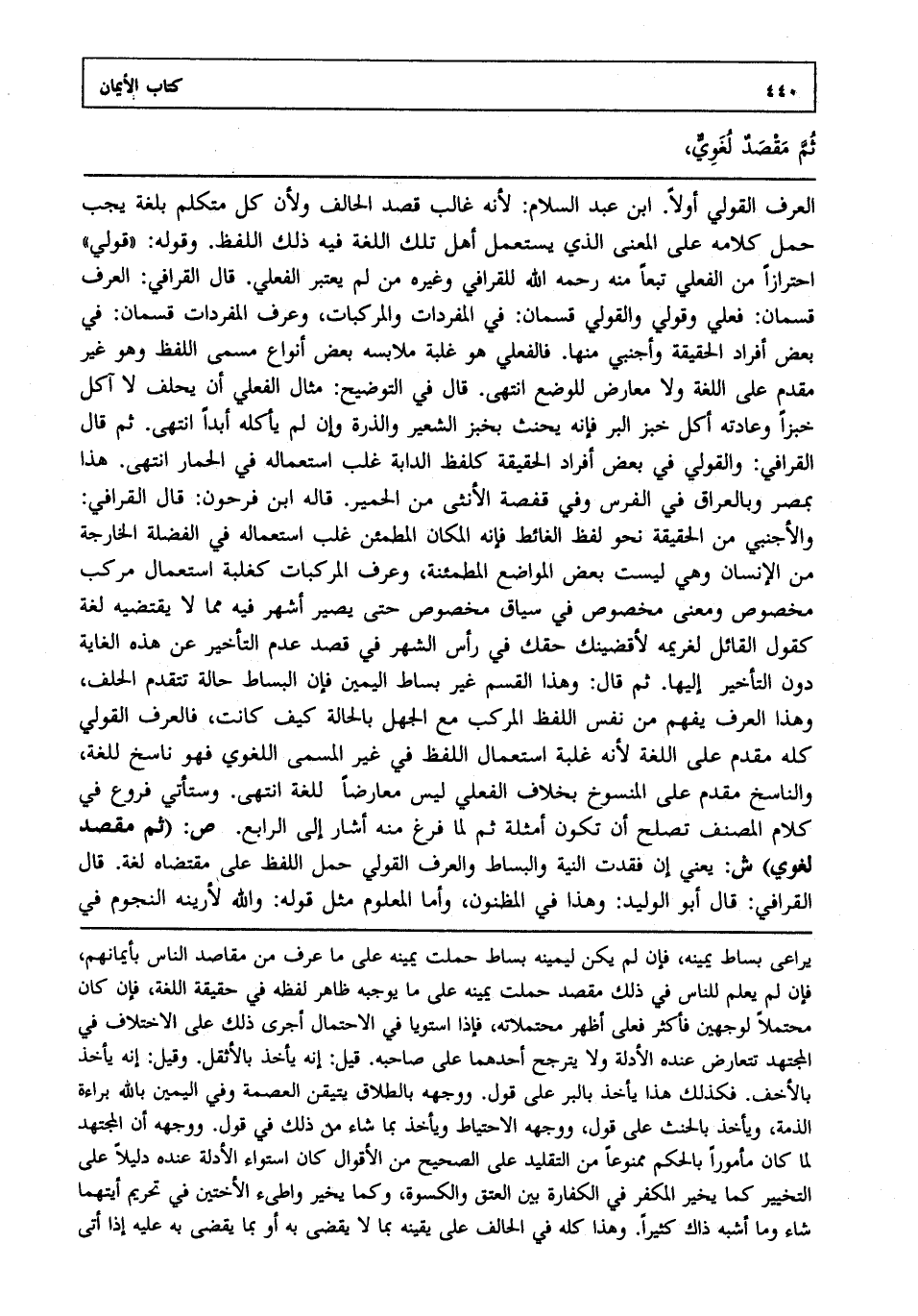 العرف القولي أولا. ابن عبد السلام لأنه غالب قصد الحالف ولأن كل متكلم بلغة يجب حمل كلامه على المعنى الذي يستعمل أهل تلك اللغة فيه ذلك اللفظ. وقوله قولي احترازا من الفعلي تبعا منه رحمه الله للقرافي وغيره من لم يعتبر الفعلي. قال القرافي العرف قسمان فعلي وقولي والقولي قسمان في المفردات والمركبات وعرف المفردات قسمان في بعض أفراد الحقيقة وأجنبي منها. فالفعلي هو غلبة ملابسه بعض أنواع مسمى اللفظ وهو غير مقدم على اللغة ولا معارض للوضع انتهى. قال في التوضيح مثال الفعلي أن يحلف لا آكل خبزا وعادته أكل خبز البر فإنه يحنث بخبز الشعير والذرة وإن لم يأكله أبدا انتهى. ثم قال القرافي والقولي في بعض أفراد الحقيقة كلفظ الدابة غلب استعماله في الحمار انتهى. هذا بمصر وبالعراق في الفرس وفي قفصة الأنثى من الحمير. قاله ابن فرحون قال القرافي والأجنبي من الحقيقة نحو لفظ الغائط فإنه المكان المطمئن غلب استعماله في الفضلة الخارجة من الإنسان وهي ليست بعض المواضع المطمئنة وعرف المركبات كغلبة استعمال مركب مخصوص ومعنى مخصوص في سياق مخصوص حتى يصير أشهر فيه مما لا يقتضيه لغة كقول القائل لغريمه لأقضينك حقك في رأس الشهر في قصد عدم التأخير عن هذه الغاية دون التأخير إليها. ثم قال وهذا القسم غير بساط اليمين فإن البساط حالة تتقدم الحلف وهذا العرف يفهم من نفس اللفظ المركب مع الجهل بالحالة كيف كانت فالعرف القولي كله مقدم على اللغة لأنه غلبة استعمال اللفظ في غير المسمى اللغوي فهو ناسخ للغة والناسخ مقدم على المنسوخ بخلاف الفعلي ليس معارضا للغة انتهى. وستأتي فروع في كلام المصنف تصلح أن تكون أمثلة ثم لما فرغ منه أشار إلى الرابع. ص: "ثم مقصد لغوي" ش: يعني إن فقدت النية والبساط والعرف القولي حمل اللفظ على مقتضاه لغة. قال القرافي قال أبو الوليد وهذا في المظنون وأما المعلوم مثل قوله والله لأرينه النجوم في