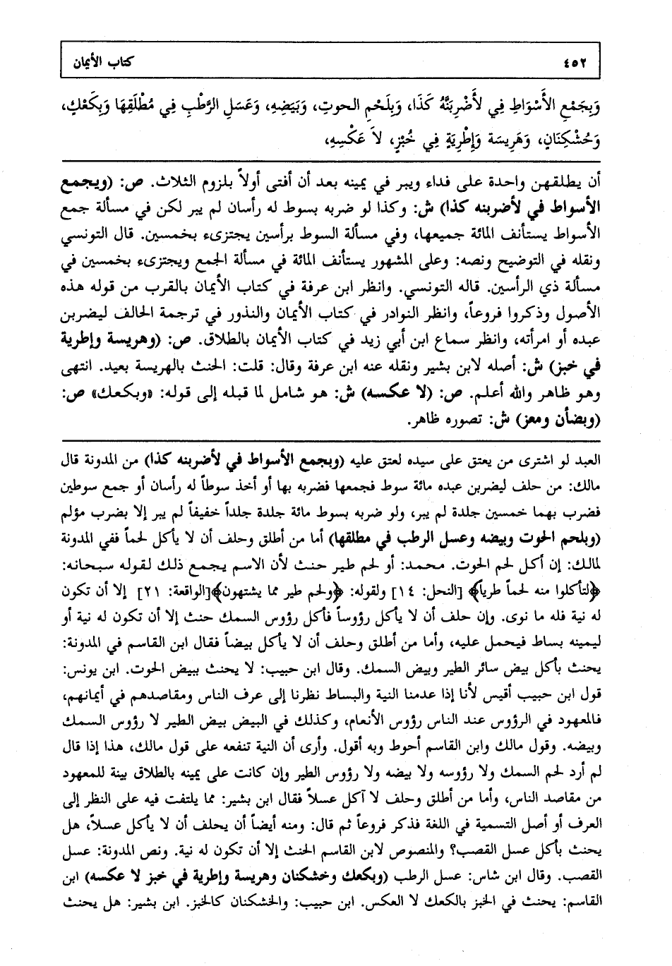 أن يطلقهن واحدة على فداء ويبر في يمينه بعد أن أفتى أولا بلزوم الثلاث. ص: "ويجمع الأسواط في لأضربنه كذا" ش: وكذا لو ضربه بسوط له رأسان لم يبر لكن في مسألة جمع الأسواط يستأنف المائة جميعها وفي مسألة السوط برأسين يجتزئ بخمسين. قال التونسي ونقله في التوضيح ونصه وعلى المشهور يستأنف المائة في مسألة الجمع ويجتزئ بخمسين في مسألة ذي الرأسين. قاله التونسي. وانظر ابن عرفة في كتاب الأيمان بالقرب من قوله هذه الأصول وذكروا فروعا وانظر النوادر في كتاب الأيمان والنذور في ترجمة الحالف ليضربن عبده أو امرأته وانظر سماع ابن أبي زيد في كتاب الأيمان بالطلاق. ص: "وهريسة وإطرية في خبز" ش: أصله لابن بشير ونقله عنه ابن عرفة وقال قلت: الحنث بالهريسة بعيد. انتهى وهو ظاهر والله أعلم. ص: "لا عكسه" ش: هو شامل لما قبله إلى قوله وبكعك ص: "وبضأن ومعز" ش: تصوره ظاهر.