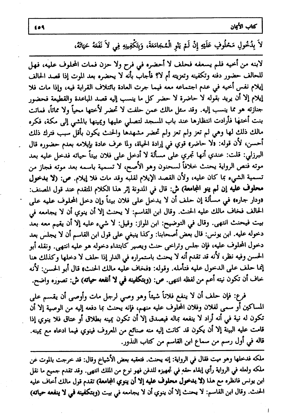 لابنه من أخيه فلم يسعفه فحلف لا أحضره في فرح ولا حزن فمات المحلوف عليه فهل للحالف حضور دفنه وتكفينه وتعزيته أم لا فأجاب بأنه لا يحضره بعد الموت إذا قصد الحالف إيلام نفس أخيه في عدم اجتماعه معه فيما جرت العادة بائتلاف القرابة فيه وإذا مات فلا إيلام إلا أن يريد بقوله لا حاضرة لا حضر كل ما ينسب إليه قصد المباعدة والقطيعة فحضور جنازته هو مما ينسب إليه. وقد سئل مالك عمن حلفت لا تحضر لأختها محيا ولا مماتا فماتت بنت أختها فأرادت انتظارها عند باب المسجد لتصلي عليها ويمينها بالمشي إلى مكة فكره مالك ذلك لها وهي لم تعز ولم تعز ولم تحضر مشهدها والحنث يكون بأقل سبب فترك ذلك أحسن لأن قوله لا حاضر قوي في إرادة الحياة ولما عرف عادة بإيلامه بعدم حضوره قال البرزلي قلت: عندي أنها تجري على مسألة لا أدخل على فلان بيتا حياته فدخل عليه بعد موته فنص الرواية يحنث خلافا لسحنون وهو الأصح لا تسمية باسمه بعد موته فجاز من ثسمية الشيء بما كان عليه ولأن القصد الإيلام لقلبه وقد مات فلا إيلام. ص: "لا بدخول محلوف عليه إن لم ينو المجامعة" ش: قال في المدونة إثر هذا الكلام المتقدم عند قول المصنف "ودار جاره" في مسألة إن حلف أن لا يدخل على فلان بيتا وإن دخل المحلوف عليه على الحالف فخاف مالك عليه الحنث. وقال ابن القاسم لا يحنث إلا أن ينوي أن لا يجامعه في بيت فيحنث انتهى. وقال في التوضيح ابن المواز وقيل لا شيء عليه إلا أن يقيم معه بعد دخوله عليه. ابن يونس قال بعض أصحابنا وكذا ينبغي على قول ابن القاسم أن لا يجلس بعد دخول المحلوف عليه فإن جلس وتراخى حنث ويصير كابتداء دخوله هو عليه انتهى. ونقله أبو الحسن وفيه نظر لأنه قد تقدم أنه لا يحنث باستمراره في الدار إذا حلف لا دخلها وكذلك هنا إنما حلف على الدخول عليه فتأمله. وقوله "فخاف عليه مالك الحنث" قال أبو الحسن لأنه خاف أن تكون نيته أعم من لفظه انتهى. ص: "وبتكفينه في لا أنفعه حياته" ش: تصوره واضح.