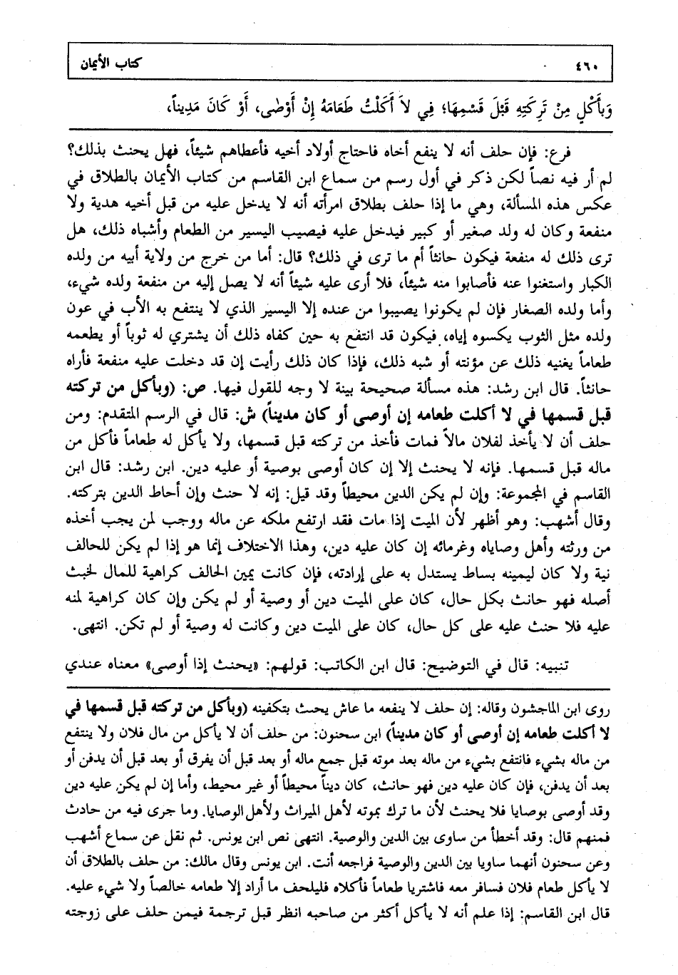 فرع: فإن حلف أنه لا ينفع أخاه فاحتاج أولاد أخيه فأعطاهم شيئا فهل يحنث بذلك لم أر فيه نصا لكن ذكر في أول رسم من سماع ابن القاسم من كتاب الأيمان بالطلاق في عكس هذه المسألة وهي ما إذا حلف بطلاق امرأته أنه لا يدخل عليه من قبل أخيه هدية ولا منفعة وكان له ولد صغير أو كبير فيدخل عليه فيصيب اليسير من الطعام وأشباه ذلك هل ترى ذلك له منفعة فيكون حانثا أم ما ترى في ذلك قال أما من خرج من ولاية أبيه من ولده الكبار واستغنوا عنه فأصابوا منه شيئا فلا أرى عليه شيئا أنه لا يصل إليه من منفعة ولده شيء وأما ولده الصغار فإن لم يكونوا يصيبوا من عنده إلا اليسير الذي لا ينتفع به الأب في عون ولده مثل الثوب يكسوه إياه فيكون قد انتفع به حين كفاه ذلك أن يشتري له ثوبا أو يطعمه طعاما يغنيه ذلك عن مؤنته أو شبه ذلك فإذا كان ذلك رأيت إن قد دخلت عليه منفعة فأراه حانثا. قال ابن رشد هذه مسألة صحيحة بينة لا وجه للقول فيها. ص: "وبأكل من تركته قبل قسمها في لا أكلت طعامه إن أوصى أو كان مدينا" ش: قال في الرسم المتقدم ومن حلف أن لا يأخذ لفلان مالا فمات فأخذ من تركته قبل قسمها ولا يأكل له طعاما فأكل من ماله قبل قسمها. فإنه لا يحنث إلا إن كان أوصى بوصية أو عليه دين. ابن رشد قال ابن القاسم في المجموعة وإن لم يكن الدين محيطا وقد قيل إنه لا حنث وإن أحاط الدين بتركته. وقال أشهب وهو أظهر لأن الميت إذا مات فقد ارتفع ملكه عن ماله ووجب لمن يجب أخذه من ورثته وأهل وصاياه وغرمائه إن كان عليه دين وهذا الاختلاف إنما هو إذا لم يكن للحالف نية ولا كان ليمينه بساط يستدل به على إرادته فإن كانت يمين الحالف كراهية للمال لخبث أصله فهو حانث بكل حال كان على الميت دين أو وصية أو لم يكن وإن كان كراهية لمنه عليه فلا حنث عليه على كل حال كان على الميت دين وكانت له وصية أو لم تكن. انتهى.