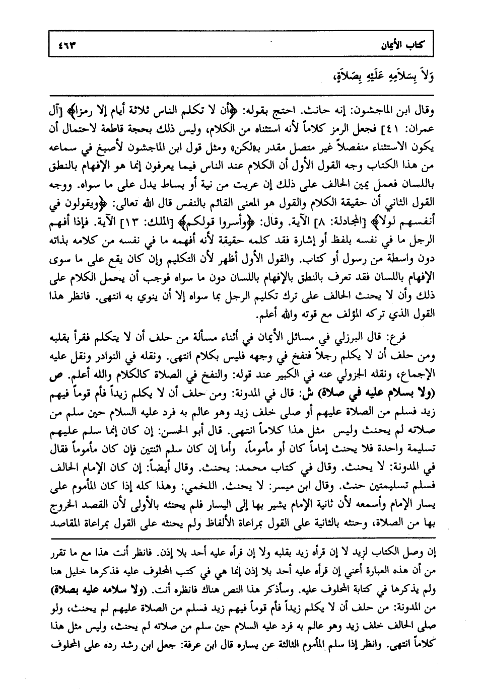 فرع: قال البرزلي في مسائل الأيمان في أثناء مسألة من حلف أن لا يتكلم فقرأ بقلبه ومن حلف أن لا يكلم رجلا فنفخ في وجهه فليس بكلام انتهى. ونقله في النوادر ونقل عليه الإجماع ونقله الجزولي عنه في الكبير عند قوله والنفخ في الصلاة كالكلام والله أعلم. ص: "ولا بسلام عليه في صلاة" ش: قال في المدونة ومن حلف أن لا يكلم زيدا فأم قوما فيهم زيد فسلم من الصلاة عليهم أو صلى خلف زيد وهو عالم به فرد عليه السلام حين سلم من صلاته لم يحنث وليس مثل هذا كلاما انتهى. قال أبو الحسن إن كان إنما سلم عليهم تسليمة واحدة فلا يحنث إماما كان أو مأموما وأما إن كان سلم اثنتين فإن كان مأموما فقال في المدونة لا يحنث. وقال في كتاب محمد يحنث. وقال أيضا إن كان الإمام الحالف فسلم تسليمتين حنث. وقال ابن ميسر لا يحنث. اللخمي وهذا كله إذا كان المأموم على يسار الإمام وأسمعه لأن ثانية الإمام يشير بها إلى اليسار فلم يحنثه بالأولى لأن القصد الخروج بها من الصلاة وحنثه بالثانية على القول بمراعاة الألفاظ ولم يحنثه على القول بمراعاة المقاصد