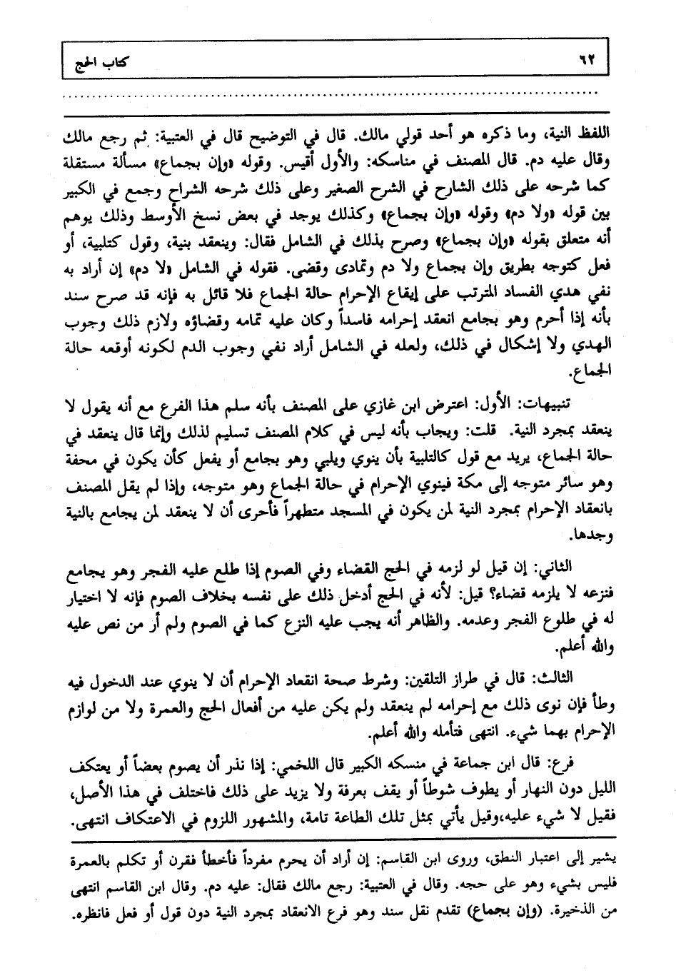 تنبيهات: الأول: اعترض ابن غازي على المصنف بأنه سلم هذا الفرع: مع أنه يقول لا ينعقد بمجرد النية. قلت: ويجاب بأنه ليس في كلام المصنف تسليم لذلك وإنما قال ينعقد في حالة الجماع يريد مع قول كالتلبية بأن ينوي ويلبي وهو بجامع أو يفعل كأن يكون في محفة وهو سائر متوجه إلى مكة فينوي الإحرام في حالة الجماع وهو متوجه وإذا لم يقل المصنف بانعقاد الإحرام بمجرد النية لمن يكون في المسجد متطهرا فأحرى أن لا ينعقد لمن يجامع بالنية وجدها.