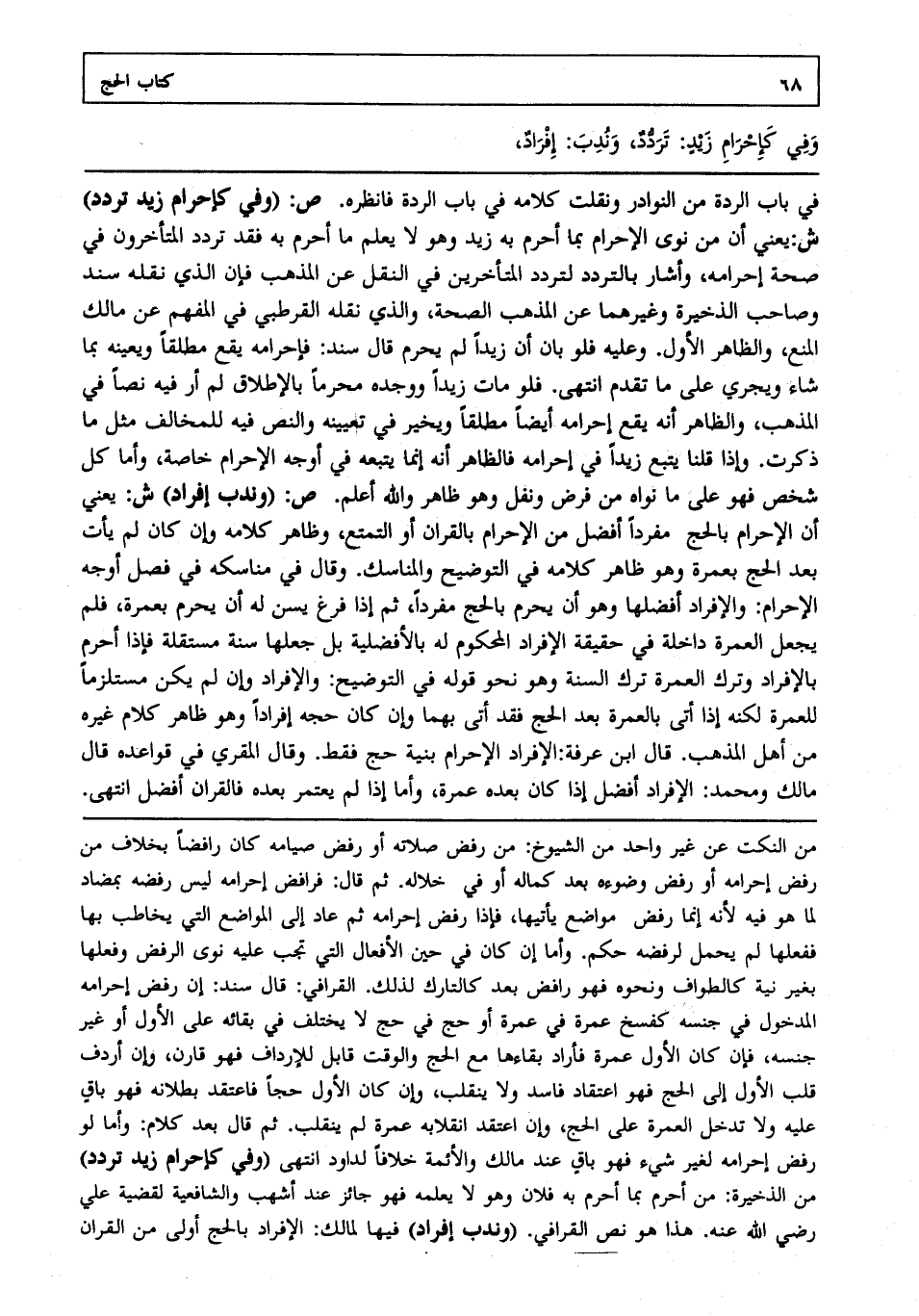 في باب الردة من النوادر ونقلت كلامه في باب الردة فانظره. ص: "وفي كإحرام زيد تردد" ش: يعني أن من نوى الإحرام بما أحرم به زيد وهو لا يعلم ما أحرم به فقد تردد المتأخرون في صحة إحرامه وأشار بالتردد لتردد المتأخرين في النقل عن المذهب فإن الذي نقله سند وصاحب الذخيرة وغيرهما عن المذهب الصحة والذي نقله القرطبي في المفهم عن مالك المنع والظاهر الأول. وعليه فلو بان أن زيدا لم يحرم قال سند فإحرامه يقع مطلقا ويعينه بما شاء ويجري على ما تقدم انتهى. فلو مات زيد ووجده محرما بالإطلاق لم أر فيه نصا في المذهب والظاهر أنه يقع إحرامه أيضا مطلقا ويخير في تعيينه والنص فيه للمخالف مثل ما ذكرت. وإذا قلنا يتبع زيدا في إحرامه فالظاهر أنه إنما يتبعه في أوجه الإحرام خاصة وأما كل شخص فهو على ما نواه من فرض ونفل وهو ظاهر والله أعلم. ص: "وندب إفراد" ش: يعني أن الإحرام بالحج مفردا أفضل من الإحرام بالقران أو التمتع وظاهر كلامه وإن كان لم يأت بعد الحج بعمرة وهو ظاهر كلامه في التوضيح والمناسك. وقال في مناسكه في فصل أوجه الإحرام والإفراد أفضلها وهو أن يحرم بالحج مفردا ثم إذا فرغ يسن له أن يحرم بعمرة فلم يجعل العمرة داخلة في حقيقة الإفراد المحكوم له بالأفضلية بل جعلها سنة مستقلة فإذا أحرم بالإفراد وترك العمرة ترك السنة وهو نحو قوله في التوضيح والإفراد وإن لم يكن مستلزما للعمرة لكنه إذا أتى بالعمرة بعد الحج فقد أتى بهما وإن كان حجه إفرادا وهو ظاهر كلام غيره من أهل المذهب. قال ابن عرفة الإفراد الإحرام بنية حج فقط. وقال المقري في قواعده قال مالك ومحمد الإفراد أفضل إذا كان بعده عمرة وأما إذا لم يعتمر بعده فالقران أفضل انتهى.