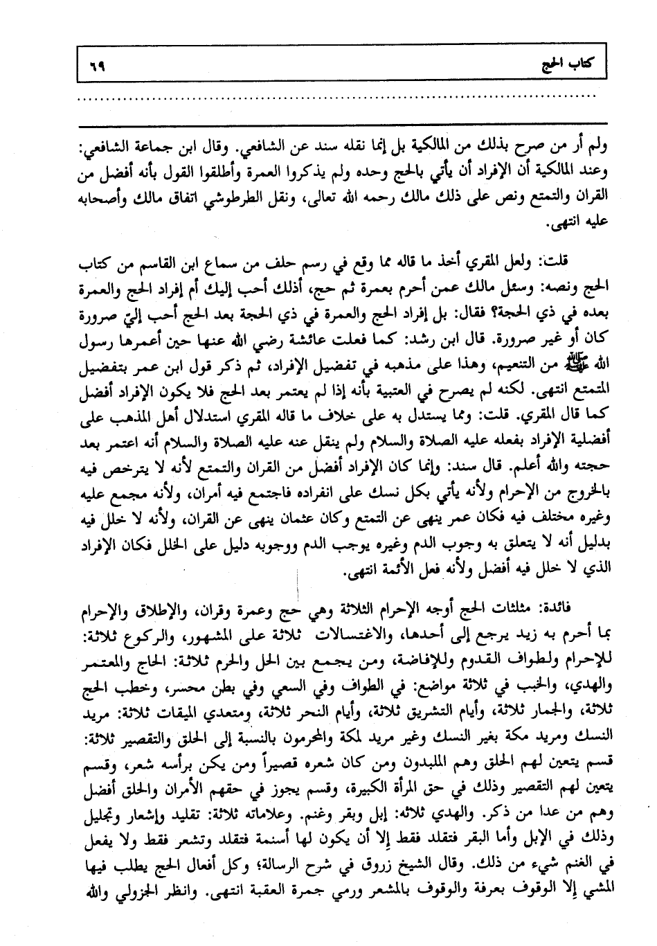 قلت: ولعل المقري أخذ ما قاله مما وقع في رسم حلف من سماع ابن القاسم من كتاب الحج ونصه وسئل مالك عمن أحرم بعمرة ثم حج أذلك أحب إليك أم إفراد الحج والعمرة بعده في ذي الحجة فقال بل إفراد الحج والعمرة في ذي الحجة بعد الحج أحب إلي صرورة كان أو غير صرورة. قال ابن رشد كما فعلت عائشة رضي الله عنها حين أعمرها رسول الله صلى الله عليه وسلم من التنعيم وهذا على مذهبه في تفضيل الإفراد ثم ذكر قول ابن عمر بتفضيل المتمتع انتهى. لكنه لم يصرح في العتبية بأنه إذا لم يعتمر بعد الحج فلا يكون الإفراد أفضل كما قال المقري. قلت: ومما يستدل به على خلاف ما قاله المقري استدلال أهل المذهب على أفضلية الإفراد بفعله عليه الصلاة والسلام ولم ينقل عنه عليه الصلاة والسلام أنه اعتمر بعد حجته والله أعلم. قال سند وإنما كان الإفراد أفضل من القران والتمتع لأنه لا يترخص فيه بالخروج من الإحرام ولأنه يأتي بكل نسك على انفراده فاجتمع فيه أمران ولأنه مجمع عليه وغيره مختلف فيه فكان عمر ينهى عن التمتع وكان عثمان ينهى عن القران ولأنه لا خلل فيه بدليل أنه لا يتعلق به وجوب الدم وغيره يوجب الدم ووجوبه دليل على الخلل فكان الإفراد الذي لا خلل فيه أفضل ولأنه فعل الأئمة انتهى.