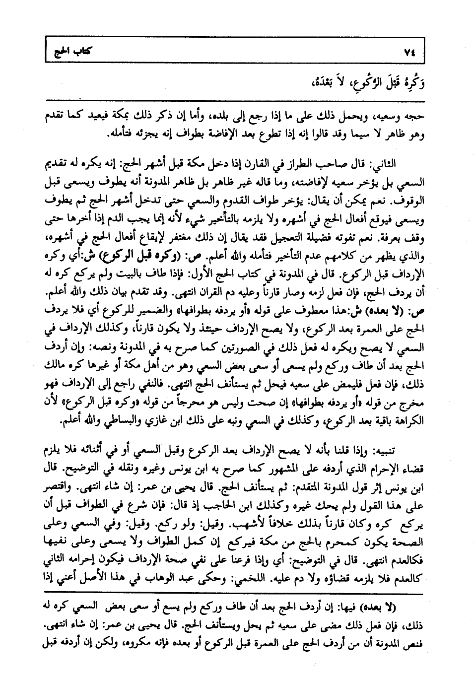 الثاني: قال صاحب الطراز في القارن إذا دخل مكة قبل أشهر الحج إنه يكره له تقديم السعي بل يؤخر سعيه لإفاضته وما قاله غير ظاهر بل ظاهر المدونة أنه يطوف ويسعى قبل الوقوف. نعم يمكن أن يقال يؤخر طواف القدوم والسعي حتى تدخل أشهر الحج ثم يطوف ويسعى فيوقع أفعال الحج في أشهره ولا يلزمه بالتأخير شيء لأنه إنما يجب الدم إذا أخرها حتى وقف بعرفة. نعم تفوته فضيلة التعجيل فقد يقال إن ذلك مغتفر لإيقاع أفعال الحج في أشهره والذي يظهر من كلامهم عدم التأخير فتأمله والله أعلم. ص: "وكره قبل الركوع" ش: أي وكره الإرداف قبل الركوع. قال في المدونة في كتاب الحج الأول فإذا طاف بالبيت ولم يركع كره له أن يردف الحج فإن فعل لزمه وصار قارنا وعليه دم القران انتهى. وقد تقدم بيان ذلك والله أعلم. ص: "لا بعده" ش: هذا معطوف على قوله "أو يردفه بطوافها" والضمير للركوع أي فلا يردف الحج على العمرة بعد الركوع ولا يصح الإرداف حينئذ ولا يكون قارنا وكذلك الإرداف في السعي لا يصح ويكره له فعل ذلك في الصورتين كما صرح به في المدونة ونصه وإن أردف الحج بعد أن طاف وركع ولم يسع أو سعى بعض السعي وهو من أهل مكة أو غيرها كره مالك ذلك فإن فعل فليمض على سعيه فيحل ثم يستأنف الحج انتهى. فالنفي راجع إلى الإرداف فهو مخرج من قوله "أو يردفه بطوافها" إن صحت وليس هو مخرجا من قوله وكره قبل الركوع لأن الكراهة باقية بعد الركوع وكذلك في السعي ونبه على ذلك ابن غازي والبساطي والله أعلم.
