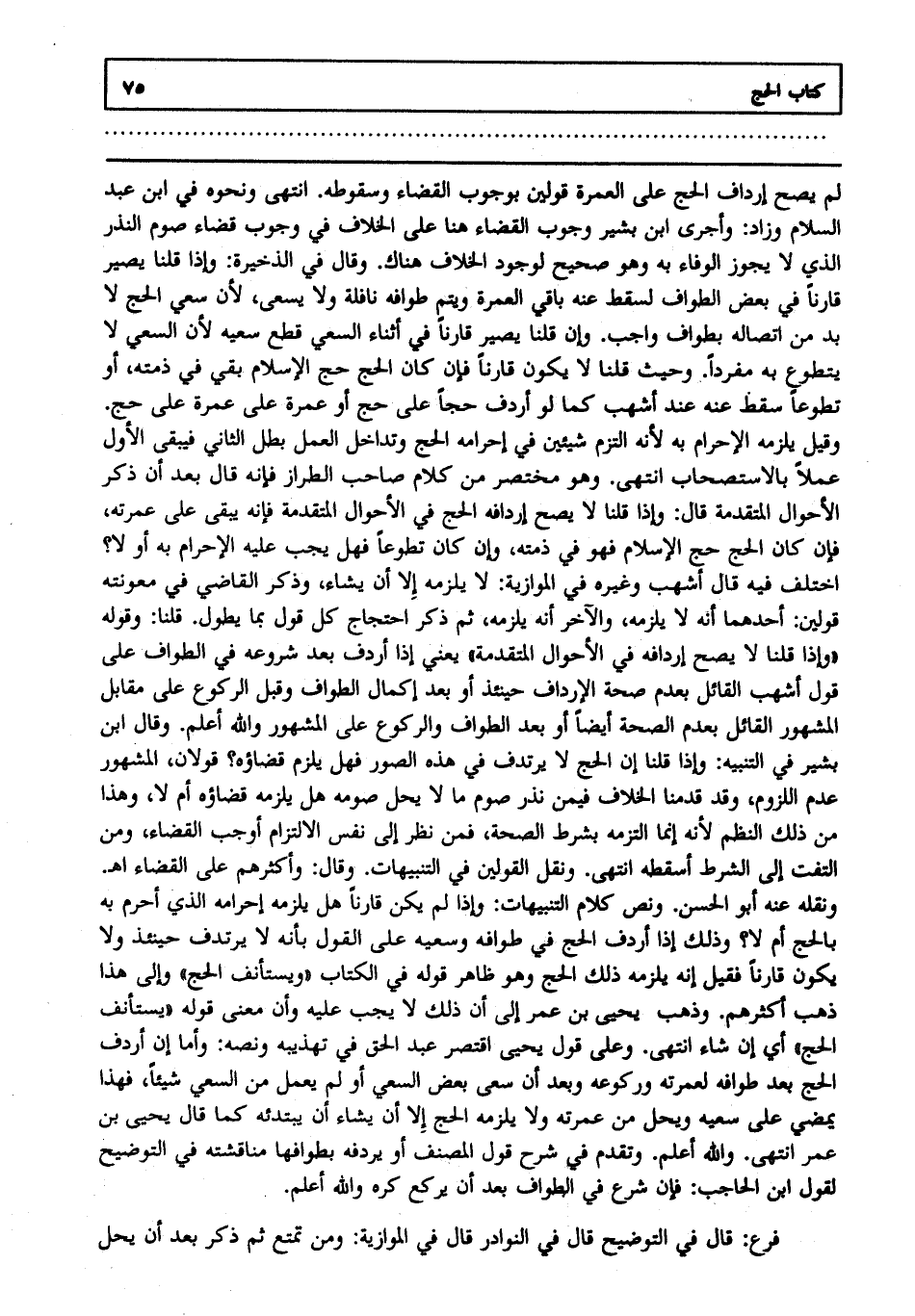 لم يصح إرداف الحج على العمرة قولين بوجوب القضاء وسقوطه انتهى ونحوه في ابن عبد السلام وزاد وأجرى ابن بشير وجوب القضاء هنا على الخلاف في وجوب قضاء صوم النذر الذي لا يجوز الوفاء به وهو صحيح لوجود الخلاف هناك. وقال في الذخيرة وإذا قلنا يصير قارنا في بعض الطواف لسقط عنه باقي العمرة ويتم طوافه نافلة ولا يسعى لأن سعي الحج لا بد من اتصاله بطواف واجب. وإن قلنا يصير قارنا في أثناء السعي قطع سعيه لأن السعي لا يتطوع به مفردا. وحيث قلنا لا يكون قارنا فإن كان الحج حج الإسلام بقي في ذمته أو تطوعا سقط عنه عند أشهب كما لو أردف حجا على حج أو عمرة على عمرة على حج. وقيل يلزمه الإحرام به لأنه التزم شيئين في إحرامه الحج وتداخل العمل بطل الثاني فيبقى الأول عملا بالاستصحاب انتهى. وهو مختصر من كلام صاحب الطراز فإنه قال بعد أن ذكر الأحوال المتقدمة قال "وإذا قلنا لا يصح إردافه الحج في الأحوال المتقدمة" فإنه يبقى على عمرته فإن كان الحج حج الإسلام فهو في ذمته وإن كان تطوعا فهل يجب عليه الإحرام به أو لا اختلف فيه قال أشهب وغيره في الموازية لا يلزمه إلا أن يشاء وذكر القاضي في معونته قولين أحدهما أنه لا يلزمه والآخر أنه يلزمه ثم ذكر احتجاج كل قول بما يطول. قلنا وقوله وإذا قلنا لا يصح إردافه في يعني إذا أردف بعد شروعه في الطواف على قول أشهب القائل بعدم صحة الإرداف حينئذ أو بعد إكمال الطواف وقبل الركوع على مقابل المشهور القائل بعدم الصحة أيضا أو بعد الطواف والركوع على المشهور والله أعلم. وقال ابن بشير في التنبيه وإذا قلنا إن الحج لا يرتدف في هذه الصور فهل يلزم قضاؤه قولان المشهور عدم اللزوم وقد قدمنا الخلاف فيمن نذر صوم ما لا يحل صومه هل يلزمه قضاؤه أم لا وهذا من ذلك النظم لأنه إنما التزمه بشرط الصحة فمن نظر إلى نفس الالتزام أوجب القضاء ومن التفت إلى الشرط أسقطه انتهى. ونقل القولين في التنبيهات وقال وأكثرهم على القضاء اه ونقله عنه أبو الحسن. ونص كلام التنبيهات وإذا لم يكن قارنا هل يلزمه إحرامه الذي أحرم به بالحج أم لا وذلك إذا أردف الحج في طوافه وسعيه على القول بأنه لا يرتدف حينئذ ولا يكون قارنا فقيل إنه يلزمه ذلك الحج وهو ظاهر قوله في الكتاب ويستأنف الحج وإلى هذا ذهب أكثرهم. وذهب يحيى بن عمر إلى أن ذلك لا يجب عليه وأن معنى قوله يستأنف الحج أي إن شاء انتهى. وعلى قول يحيى اقتصر عبد الحق في تهذيبه ونصه وأما إن أردف الحج بعد طوافه لعمرته وركوعه وبعد أن سعى بعض السعي أو لم يعمل من السعي شيئا فهذا يمضي على سعيه ويحل من عمرته ولا يلزمه الحج إلا أن يشاء أن يبتدئه كما قال يحيى بن عمر انتهى. والله أعلم. وتقدم في شرح قول المصنف أو يردفه بطوافها مناقشته في التوضيح لقول ابن الحاجب فإن شرع في الطواف بعد كره والله أعلم.