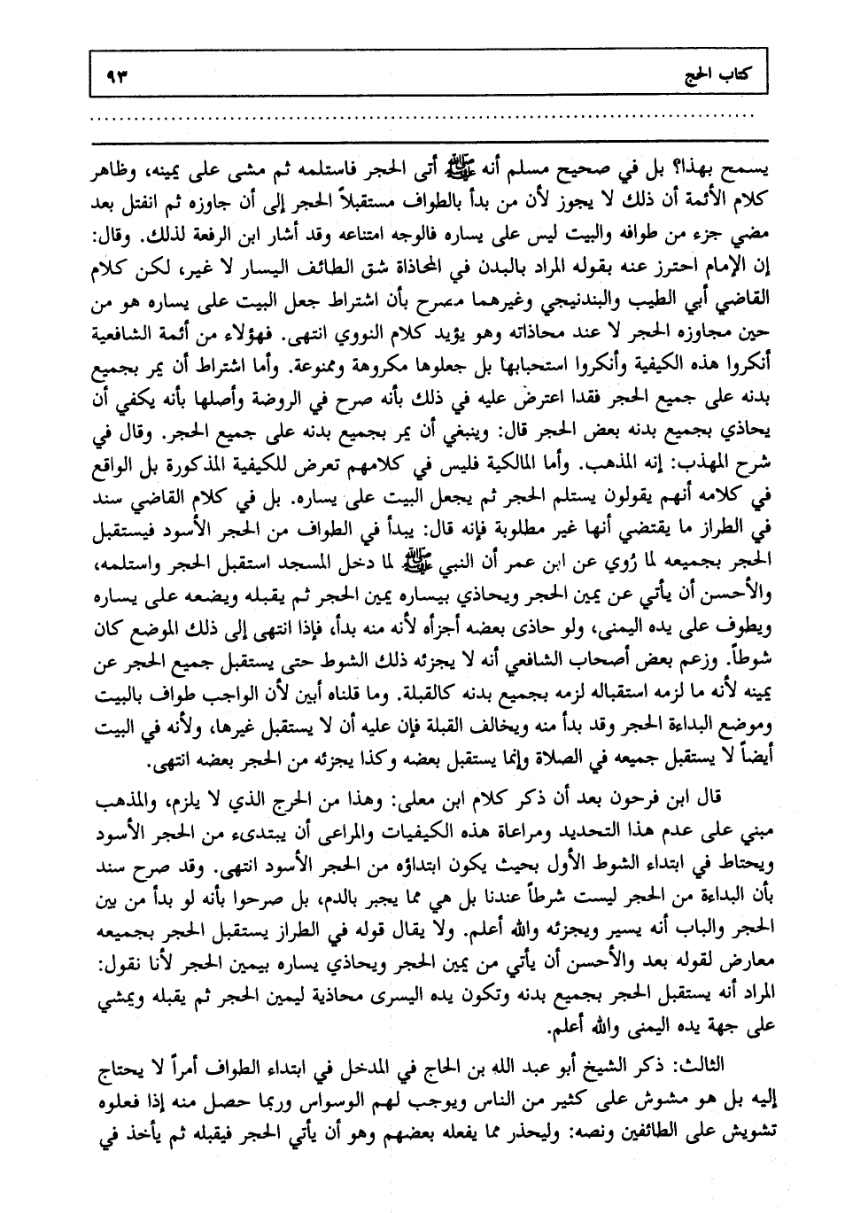 الثالث: ذكر الشيخ أبو عبد الله بن الحاج في المدخل في ابتداء الطواف أمرا لا يحتاج إليه بل هو مشوش على كثير من الناس ويوجب لهم الوسواس وربما حصل منه إذا فعلوه تشويش على الطائفين ونصه وليحذر مما يفعله بعضهم وهو أن يأتي الحجر فيقبله ثم يأخذ في