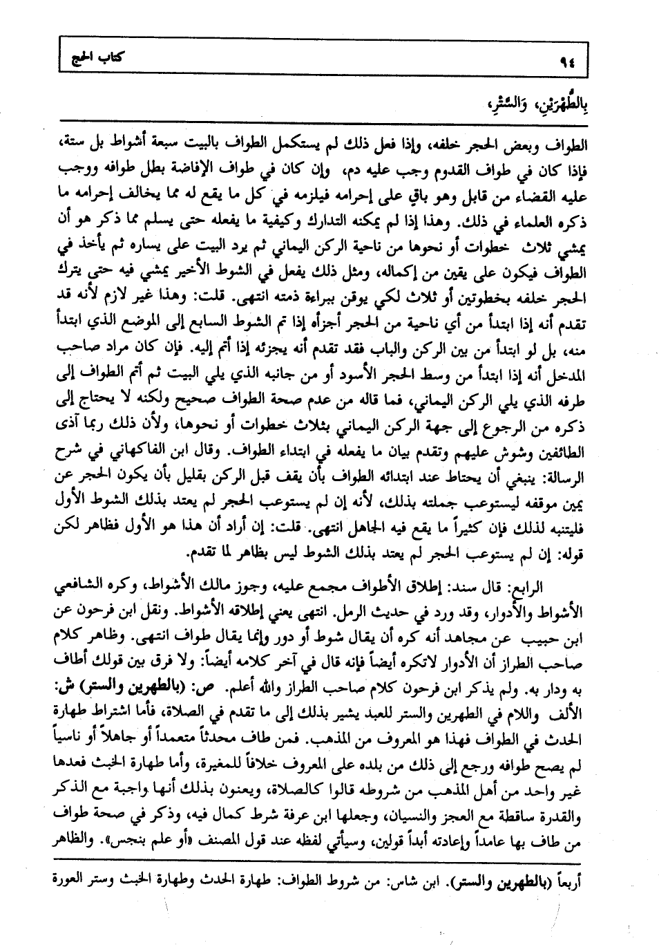 الرابع: قال سند إطلاق الأطواف مجمع عليه وجوز مالك الأشواط وكره الشافعي الأشواط والأدوار وقد ورد في حديث الرمل. انتهى يعني إطلاقه الأشواط. ونقل ابن فرحون عن ابن حبيب عن مجاهد أنه كره أن يقال شوط أو دور وإنما يقال طواف انتهى. وظاهر كلام صاحب الطراز أن الأدوار لاتكره أيضا فإنه قال في آخر كلامه أيضا ولا فرق بين قولك أطاف به ودار به. ولم يذكر ابن فرحون كلام صاحب الطراز والله أعلم. ص: "بالطهرين والستر" ش: الألف واللام في الطهرين والستر للعبد يشير بذلك إلى ما تقدم في الصلاة فأما اشتراط طهارة الحدث في الطواف فهذا هو المعروف من المذهب. فمن طاف محدثا متعمدا أو جاهلا أو ناسيا لم يصح طوافه ورجع إلى ذلك من بلده على المعروف خلافا للمغيرة وأما طهارة الخبث فعدها غير واحد من أهل المذهب من شروطه قالوا كالصلاة ويعنون بذلك أنها واجبة مع الذكر والقدرة ساقطة مع العجز والنسيان وجعلها ابن عرفة شرط كمال فيه وذكر في صحة طواف من طاف بها عامدا وإعادته أبدا قولين وسيأتي لفظه عند قول المصنف "أو علم بنجس". والظاهر