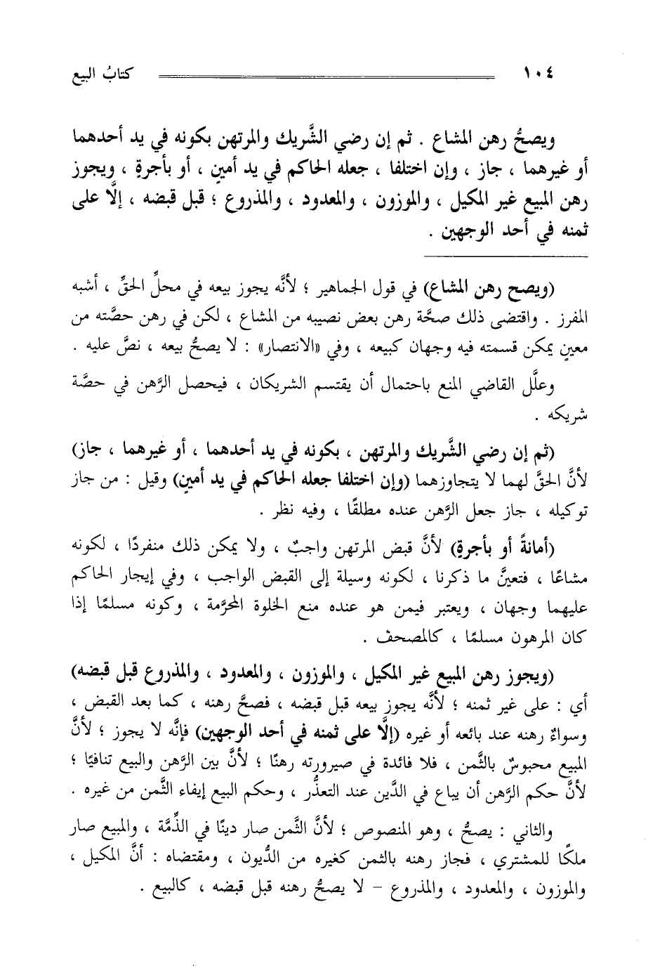 "ويجوز رهن المبيع غيرالمكيل والموزون والمعدود والمذروع قبل قبضه" أي: على غيرثمنه لأنه يجوز بيعه قبل قبضه فصح رهنه كما بعد القبض وسواء رهنه عند بائعه أو غيره "إلا على ثمنه في أحد الوجهين" فإنه لا يجوز لأن المبيع محبوس بالثمن فلا فائدة في صيرورته رهنا لأن بين الرهن والبيع تنافيا لأن حكم الرهن أن يباع في الدين عند التعذر وحكم البيع أيفاء الثمن من غيره