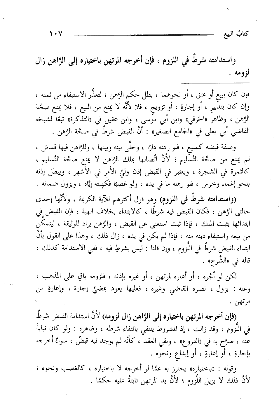 "واستدامته شرط في اللزوم" وهو قول أكثرهم للآية الكريمة ولأنها إحدى حالتي الرهن فكان القبض فيه شرطا كالابتداء بخلاف الهبة فإن القبض في ابتدائها يثبت الملك فإذا ثبت استغنى عن القبض والرهن يراد للوثيقة ليتمكن من بيعه واستيفاء دينه منه فإذا لم يكن في يده زال ذلك وهذا على القول بأن ابتداء القبض شرط في اللزوم وإن قلنا: ليس بشرط فيه ففي الاستدامة كذلك قاله في الشرح