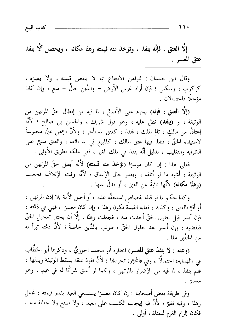 "وعنه: لا ينفذ عتق المعسر" اختاره أبو محمد الجوزي وذكرها أبو الخطاب في الهداية احتمالا وفي المحرر تخريجا لأن نفوذ عتقه يسقط الوثيقة وبدلها فلم ينفذ لما فيه من الإضرار بالمرتهن وكما لو أعتق شركا له في عبد وهو معسر