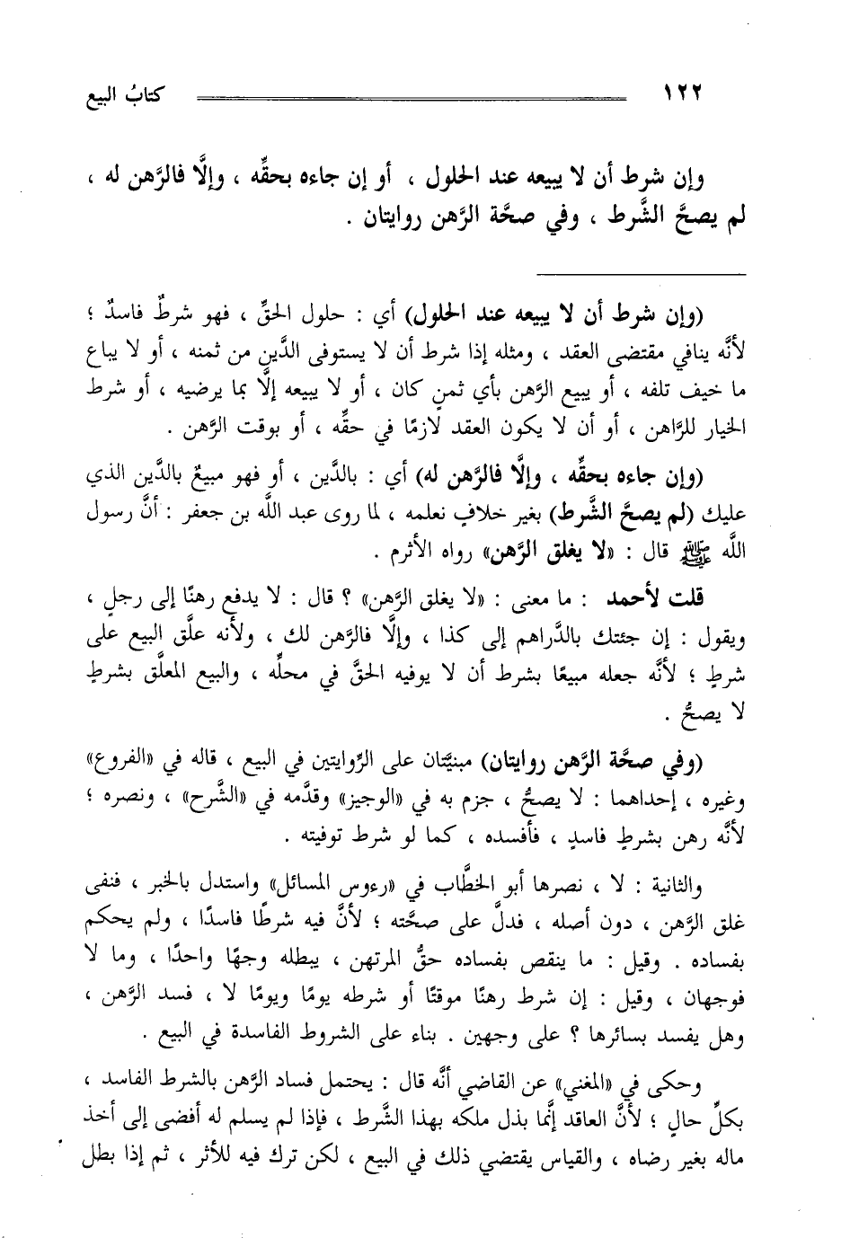والثانية: لا نصرها أبو الخطاب في رؤوس المسائل واستدل بالخبر فنفى غلق الرهن دون أصله فدل على صحته لأن فيه شرطا فاسدا ولم يحكم بفساده وقيل: ما ينقص بفساده حق المرتهن يبطله وجها واحدا ومالا فوجهان وقيل: إن شرط رهنا موقتا أو شرطه يوما ويوما لا فسد الرهن وهل يفسد بسائرها على وجهين بناء على الشروط الفاسدة في البيع. وحكى في المغني عن القاضي أنه قال يحتمل فساد الرهن بالشرط الفاسد بكل حال لأن العاقد إنما بذل ملكه بهذا الشرط فإذا لم يسلم له أفضى إلى أخذ ماله بغير رضاه والقياس يقتضي ذلك في البيع لكن ترك فيه للأثر ثم إذا بطل