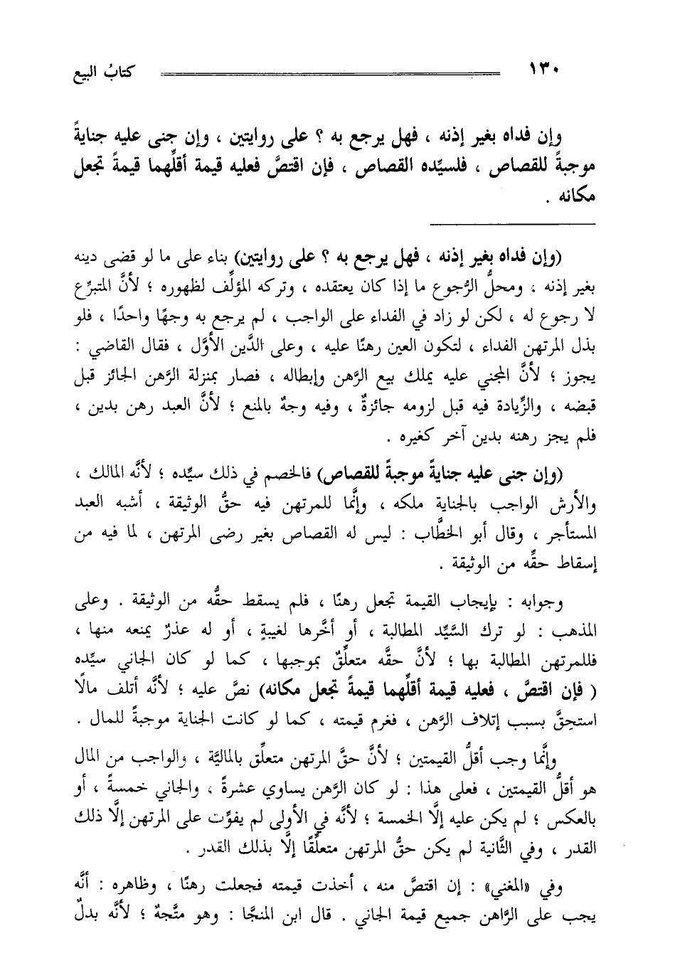 وجوابه: بإيجاب القيمة تجعل رهنا فلم يسقط حقه من الوثيقة وعلى المذهب لو ترك السيد المطالبة أو أخرها لغيبة أو له عذر يمنعه منها فللمرتهن المطالبة بها لأن حقه متعلق بموجبها كما لو كان الجاني سيده "فإن اقتص فعليه قيمة أقلهما قيمة تجعل مكانه" نص عليه لأنه أتلف مالا استحق بسبب إتلاف الرهن فغرم قيمته كما لو كانت الجناية موجبة للمال. وإنما وجب أقل القيمتين لأن حق المرتهن متعلق بالمالية والواجب من المال هو أقل القيمتين فعلى هذا لو كان الرهن يساوي عشرة والجاني خمسة أو بالعكس لم يكن عليه إلا الخمسة لأنه في الأولى: لم يفوت على المرتهن إلا ذلك القدر وفي الثانية: لم يكن حق المرتهن متعلقا إلا بذلك القدر