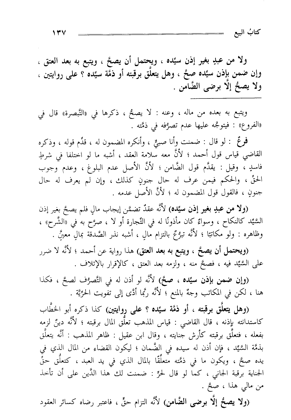 ولا من عبد بغير إذن سيده ويحتمل أن يصح ويتبع به بعد العتق وإن ضمن بإذن سيده صح وهل يتعلق برقبته أو ذمة سيده على روايتين ولا يصح إلا برضى الضامن.